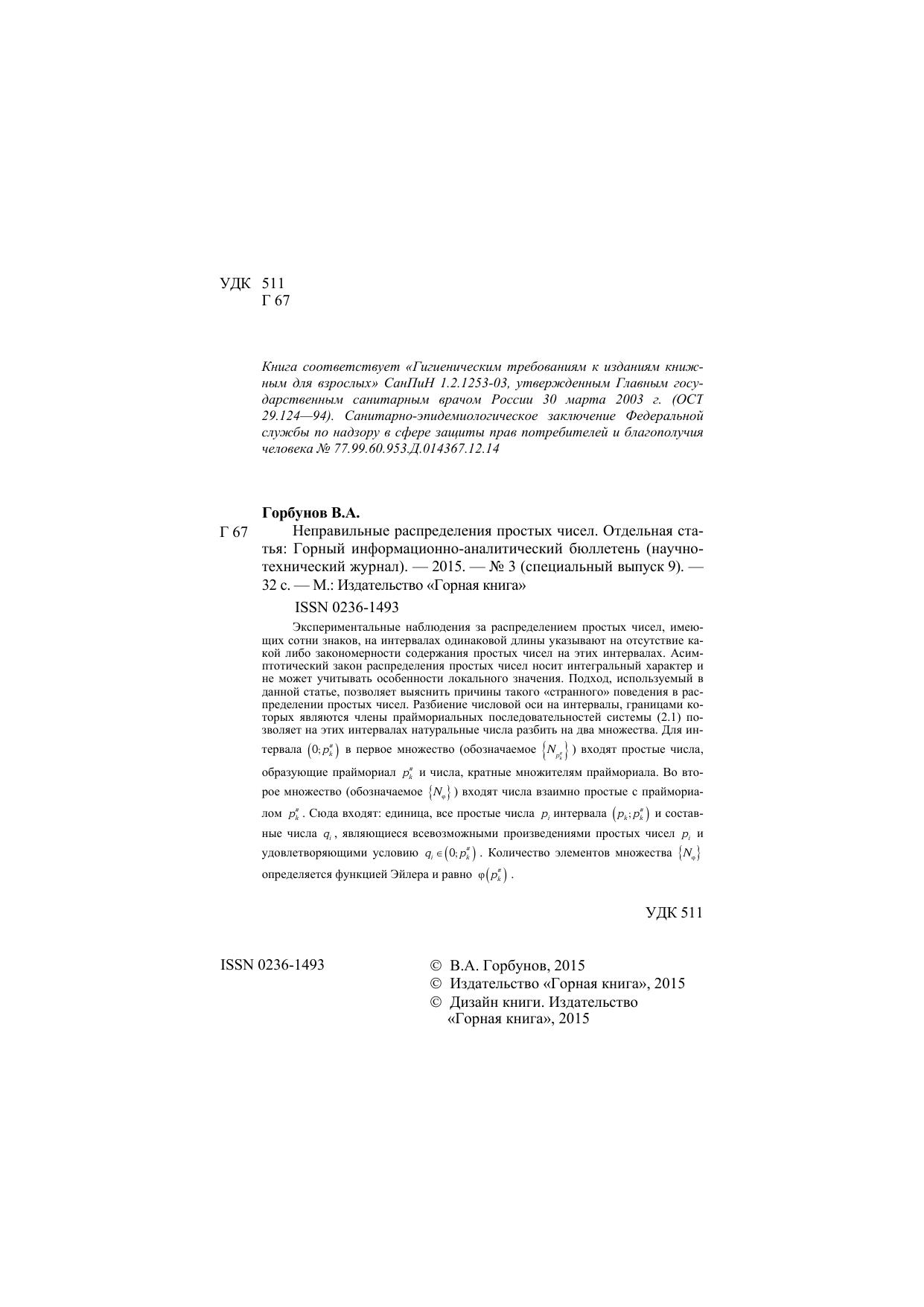 Неправильные распределения простых чисел. Отдельная статья: Горный информационно-аналитический бюллетень (научно-технический журнал)