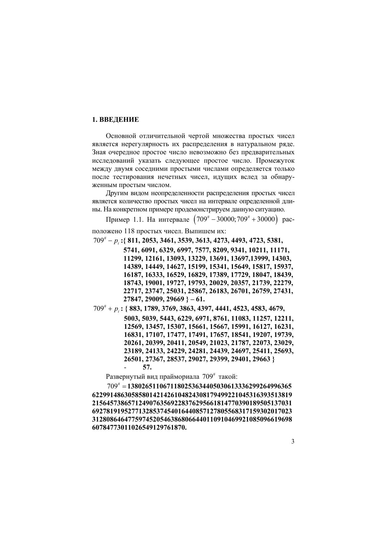 Экспериментальные наблюдения за распределением простых чисел, имеющих сотни знаков, на интервалах одинаковой длины указывают на отсутствие какой либо закономерности содержания простых чисел на этих интервалах. Асимптотический закон распределения простых чисел носит интегральный характер и не может учитывать особенности локального значения. Подход, используемый в данной статье, позволяет выяснить причины такого «странного» поведения в распределении простых чисел. Разбиение числовой оси на интервалы, границами которых являются члены праймориальных последовательностей системы (2.1) позволяет на этих интервалах натуральные числа разбить на два множества. Для интервала () k p # 0; в первое множество (обозначаемое { } k p N # ) входят простые числа, образующие праймориал k p # и числа, кратные множителям праймориала. Во второе множество (обозначаемое { } N ϕ ) входят числа взаимно простые с праймориалом k p # . Сюда входят: единица, все простые числа i p интервала ( ) k k p p # ; и составные числа i q , являющиеся всевозможными произведениями простых чисел i p и удовлетворяющими условию ( ) i k q p # 0; ∈ . Количество элементов множества { } N ϕ определяется функцией Эйлера и равно ( ) k p # ϕ .