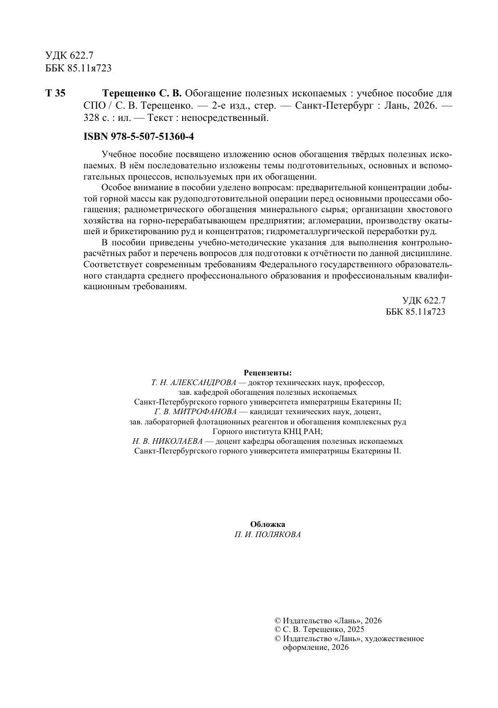 Учебное пособие посвящено изложению основ обогащения твёрдых полезных ископаемых. В нём последовательно изложены темы подготовительных, основных и вспомогательных процессов, используемых при их обогащении. Особое внимание в пособии уделено вопросам: предварительной концентрации добытой горной массы как рудоподготовительной операции перед основными процессами обогащения, радиометрического обогащения минерального сырья, организации хвостового хозяйства на горно-перерабатывающем предприятии, агломерации, производству окатышей и брикетированию руд и концентратов, гидрометаллургической переработки руд. В пособии приведены учебно-методические указания для выполнения контрольно-расчётных работ и перечень вопросов для подготовки к отчётности по данной дисци-плине. Соответствует современным требованиям Федерального государственного образовательного стандарта среднего профессионального образования и профессиональным квалификационным требованиям.
