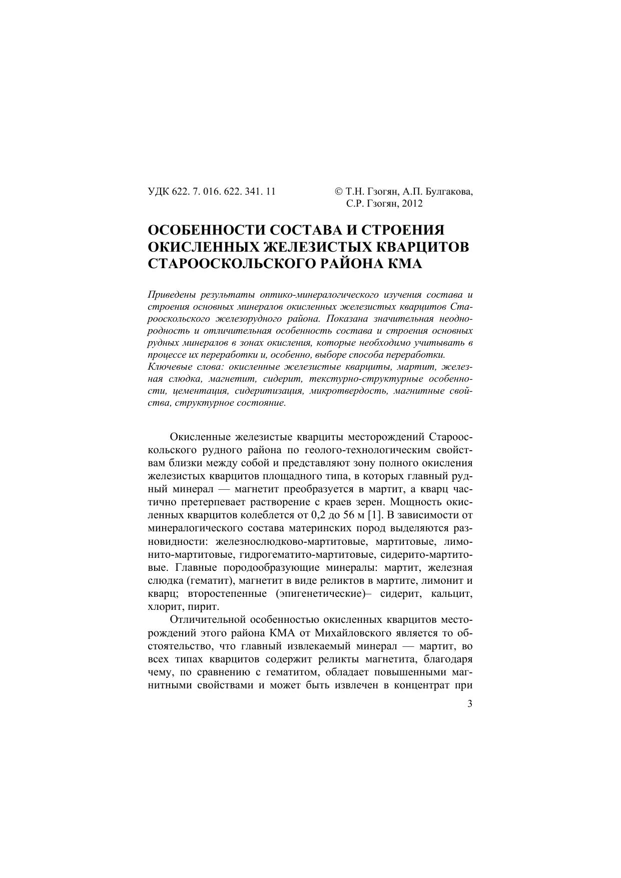 Описаны особенности состава и строения попутно добываемых окисленных железистых кварцитов Михайловского месторождения и месторождений Старооскольского железорудного района. Приведены результаты оптико-минералогического изучения состава и строения основных минералов, составляющих окисленные кварциты. Показана значительная неоднородность и отличительная особенность состава и строения основных рудных минералов в зонах окисления, которые необходимоучитывать в процессе их переработки и, особенно, выборе способа переработки. Приведены теоретические и экспериментальные исследования изменения состава и свойств минералов окисленных кварцитов Михайловского месторождения с помощью различных дозированных энергетических воздействий: взрывное воздействие, термический нагрев, низкотемпературная плазма, СВЧ-обработка, энергия ускоренных электронов.