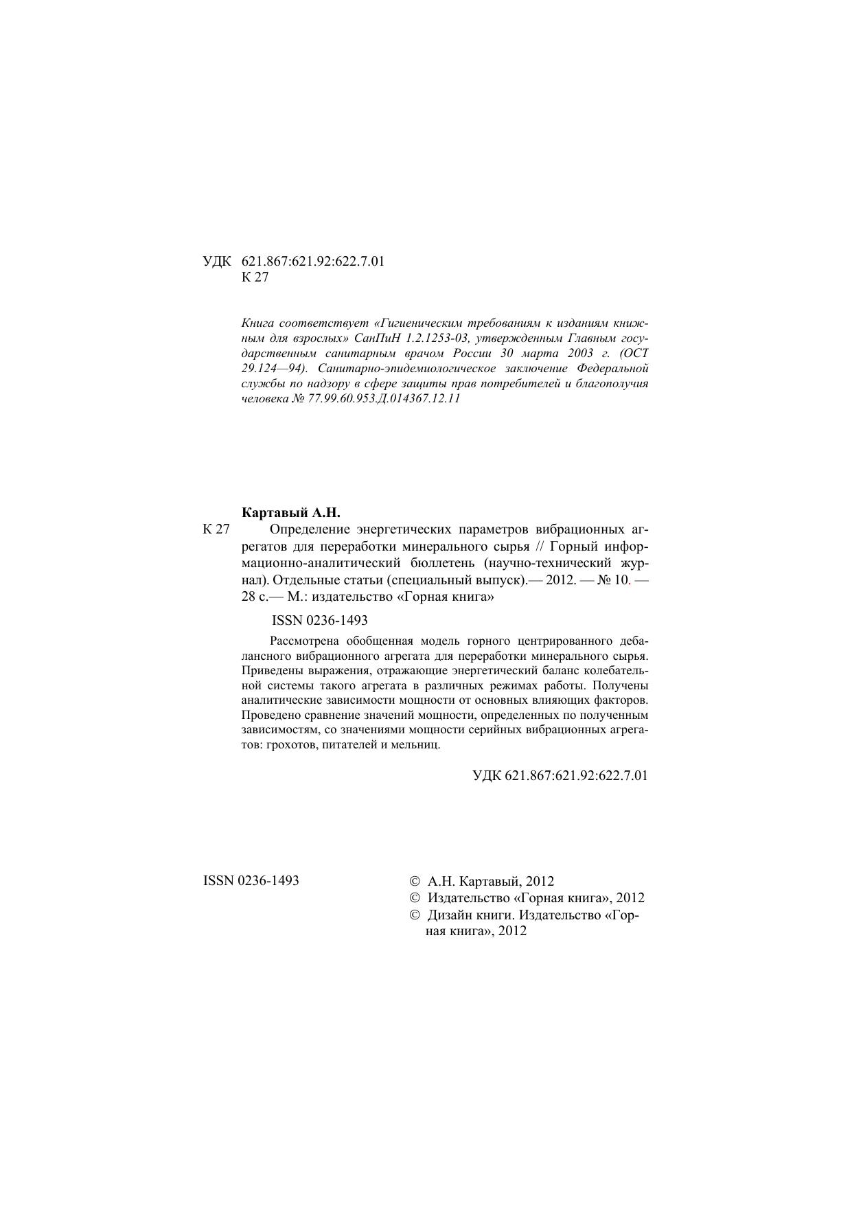 Рассмотрена обобщенная модель горного центрированного дебалансного вибрационного агрегата для переработки минерального сырья. Приведены выражения, отражающие энергетический баланс колебательной системы такого агрегата в различных режимах работы. Получены аналитические зависимости мощности от основных влияющих факторов. Проведено сравнение значений мощности, определенных по полученным зависимостям, со значениями мощности серийных вибрационных агрегатов: грохотов, питателей и мельниц.