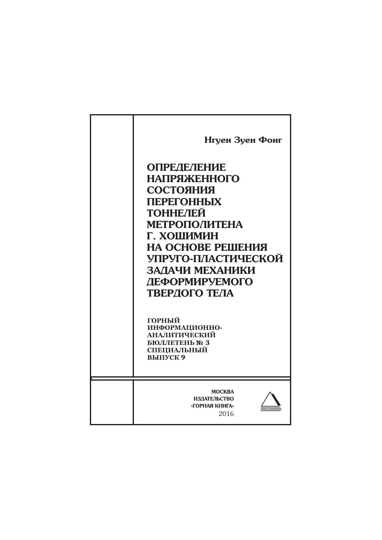 Определение напряженного состояния перегонных тоннелей метрополитена г. Хошимин на основе решения упруго-пластической задачи механики деформируемого твердого тела. Отдельная статья: Горный информационно-аналитический бюллетень (научно-технический журнал)