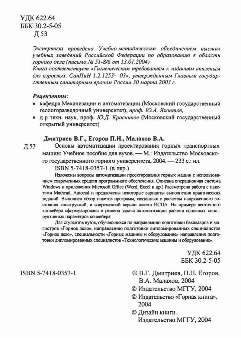 Изложены вопросы автоматизации проектирования горных машин с использованием современных средств программного обеспечения. Описана операционная система Windows и приложения Microsoft Office ( Word, Excel и др.) Рассмотрена работа с пакетами Mathcad и Autocad и предложены некоторые варианты выполнения практических заданий. Выполнен обзор пакетов программ, связанных с расчетом напряженного состояния конструкций, и современной версии пакета ИСПА. На примере ленточного конвейера сформулирована и решена задача автоматизации расчета основных конструктивных параметров конвейера. Для студентов вузов, обучающихся по направлению подготовки бакалавров и магистров «Горное дело», направлению подготовки дипломированных специалистов «Горное дело», специальности «Горные машины и оборудование» направления подготовки дипломированных специалистов «Технологические машины и оборудование».