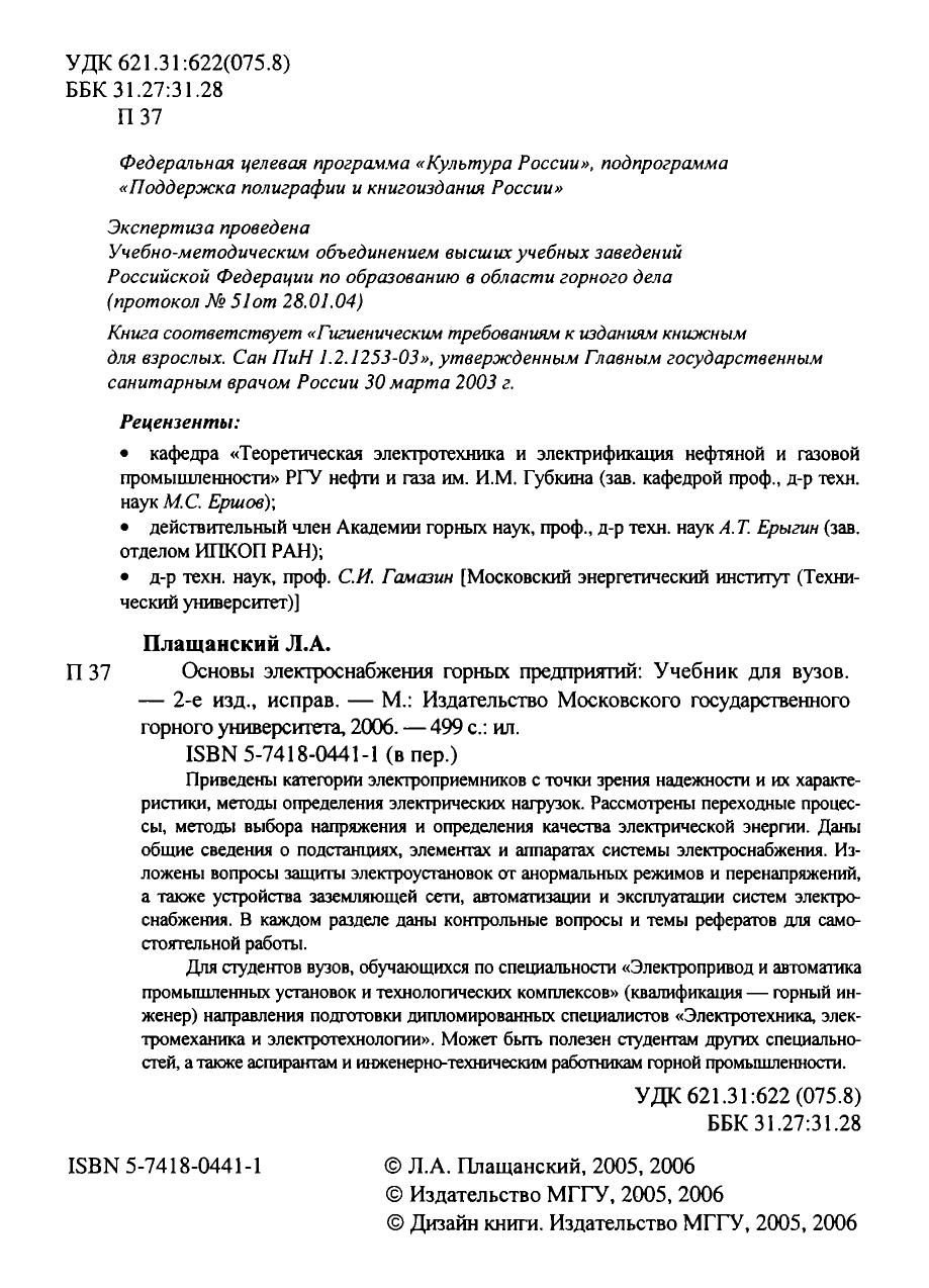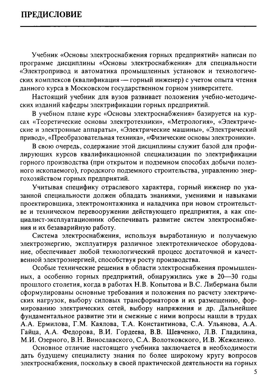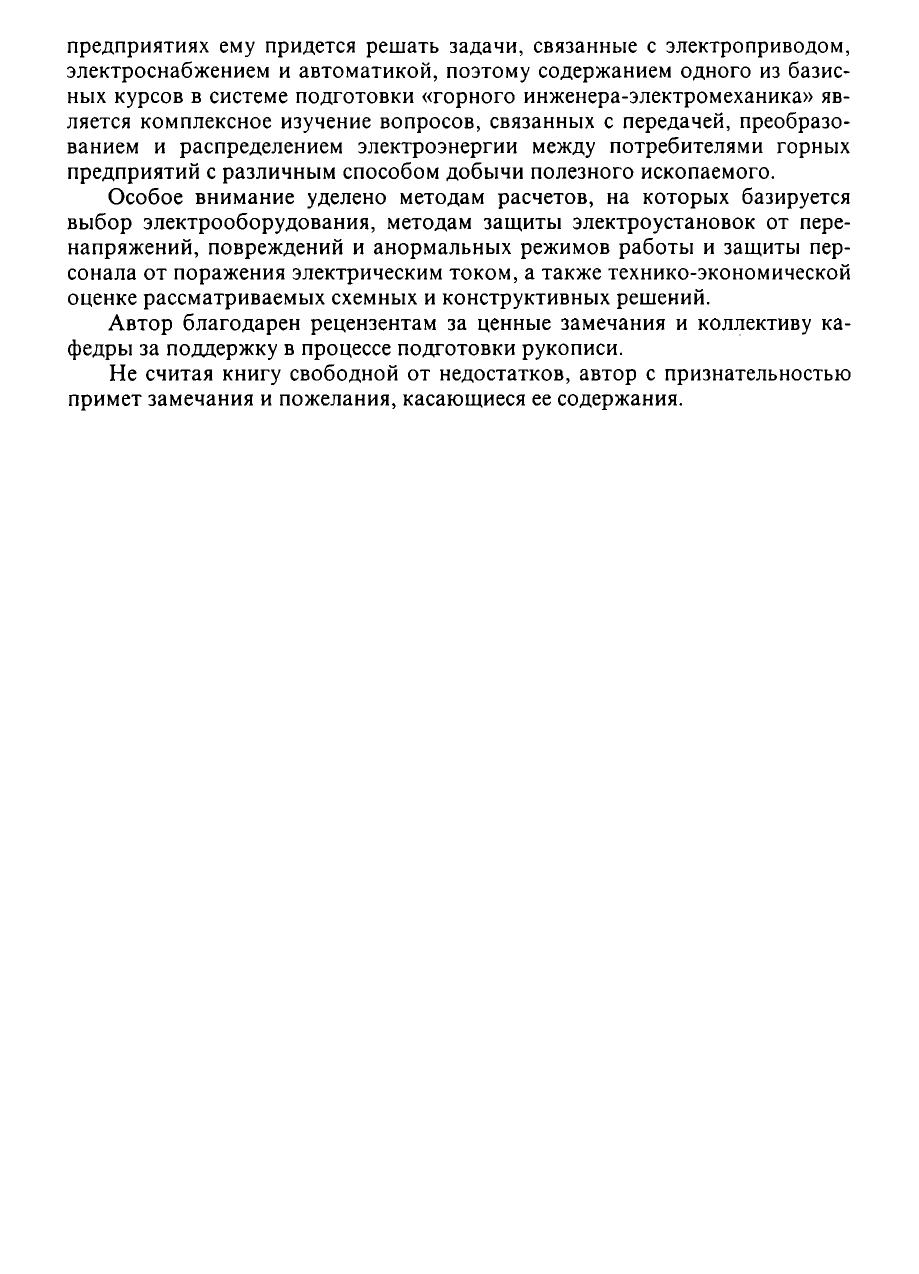 Приведены категории электроприемников с точки зрения надежности и их характеристики, методы определения электрических нагрузок. Рассмотрены переходные процессы, методы выбора напряжения и определения качества электрической энергии. Даны общие сведения о подстанциях, элементах и аппаратах системы электроснабжения. Изложены вопросы защиты электроустановок от аномальных режимов и перенапряжений, а также устройства заземляющей сети, автоматизации и эксплуатации систем электроснабжения. В каждом разделе даны контрольные вопросы и темы рефератов для самостоятельной работы. Для студентов вузов, обучающихся по специальности «Электропривод и автоматика промышленных установок и технологических комплексов» (квалификация — горный инженер) направления подготовки дипломированных специалистов «Электротехника, электромеханика и электротехнологии», может быть полезен студентам других специальностей, а также аспирантам и инженерно-техническим работникам горной промышленности.