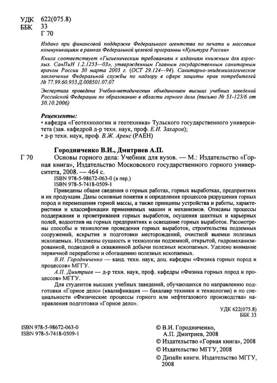 Гриф: Допущено Учебно-методическим объединением вузов Poccийcкой Федерации по образованию в области гopнoгo дела в качtестве учебника для студентов вузов, обучтощихся по направлению «Горное дело» (квалификация- бакеалавр техники и технологии) и по специальности «Физические процессы гopнoгo или нефтегазового производства» направления подготовки «Горное дело»