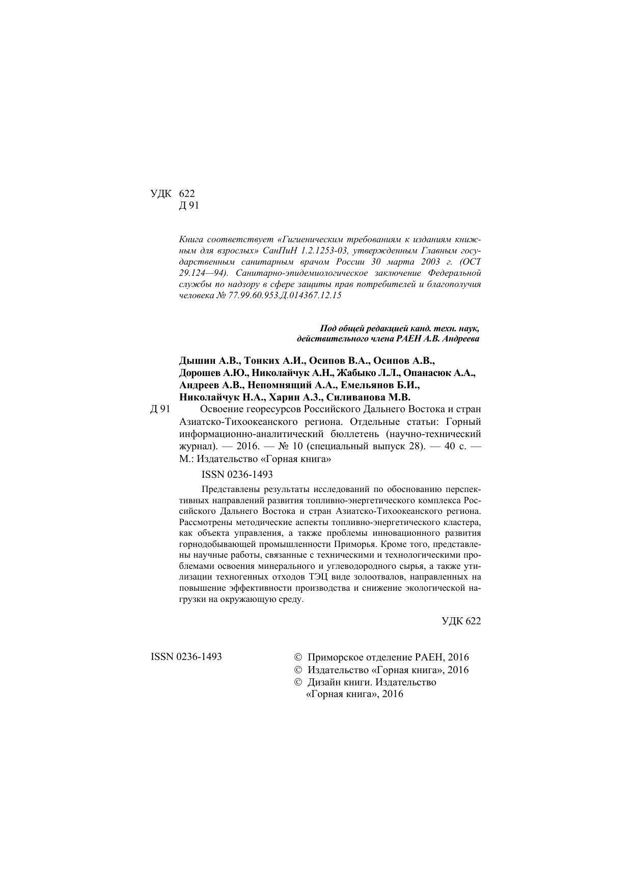 Освоение георесурсов Российского Дальнего Востока и стран Азиатско-Тихоокеанского региона. Отдельные статьи: Горный информационно-аналитический бюллетень (научно-технический журнал)