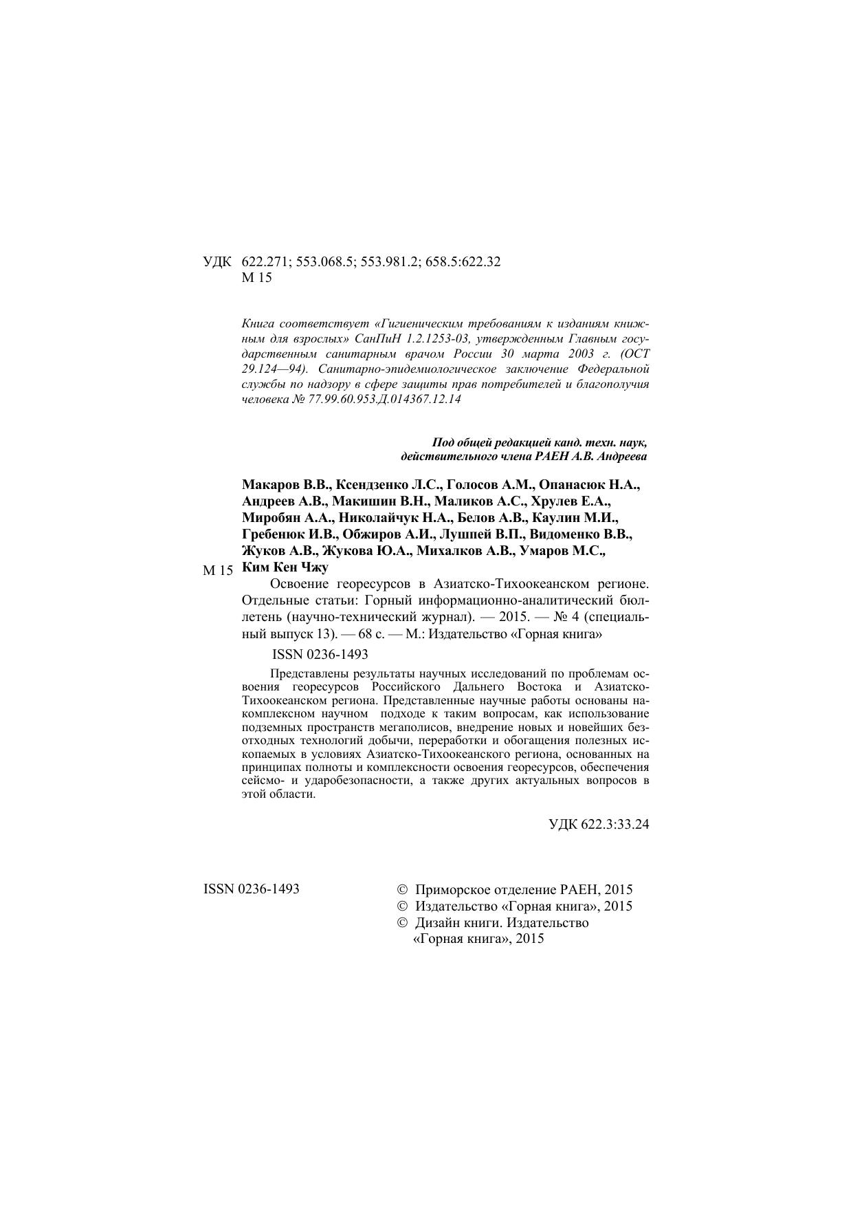Освоение георесурсов в Азиатско-Тихоокеанском регионе. Отдельные статьи: Горный информационно-аналитический бюллетень (научно-технический журнал)