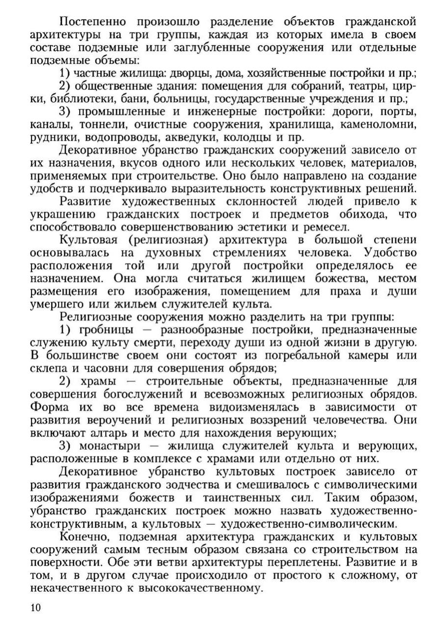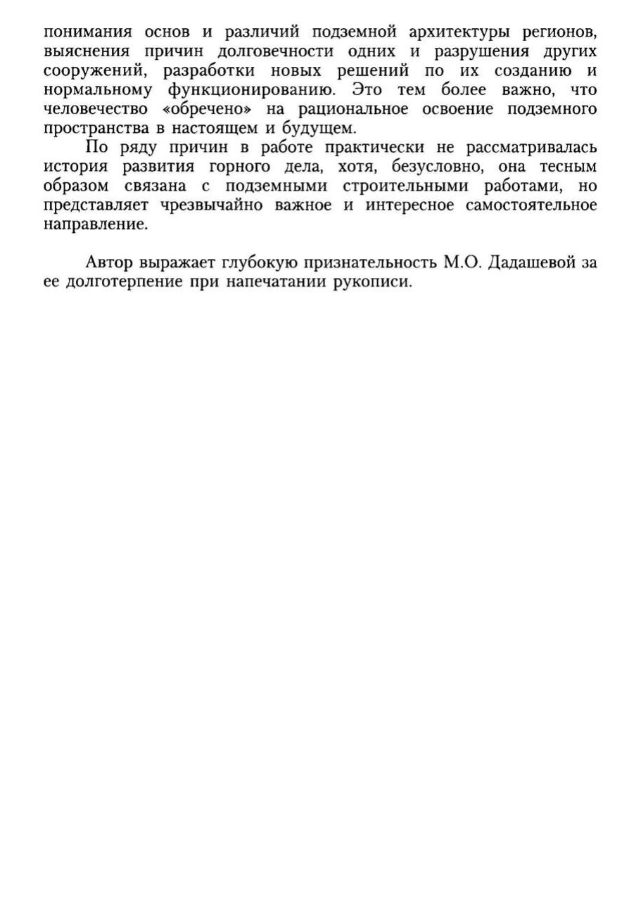 В краткой форме рассмотрены история создания подземных и заглубленных объектов различного назначения, особенности конструкций и опыт производства работ, приобретенный человечеством на пути своего доиндустриального развития. Уделено большое внимание формированию гражданской и культовой архитектуры различных стран и регионов, объемно-планировочным решениям и конструкциям, условиям и технологии строительства, а также эксплуатации сооружений, общим подходам, выработанным производителями работ при освоении подземного пространства. Изложены общие концепции возведения и использования сооружений, становления и развития их архитектурных форм. Приведены факторы, оказавшие наибольшее влияние на долговечность проектных и строительных работ. Даны различные архитектурные и строительные решения, описаны их особенности и общие черты. Книга написана популярным языком, насыщена примерами и фактами, богато иллюстрирована. В ней имеется 143 рисунка и 14 фотографий. Для студентов вузов, обучающихся по основным образовательным программам магистров «Строительство шахт и подземных сооружений» и «Сооружение подземного пространства городов» направления подготовки бакалавров и магистров «Горное дело». Может быть интересна и полезна широкому кругу читателей.