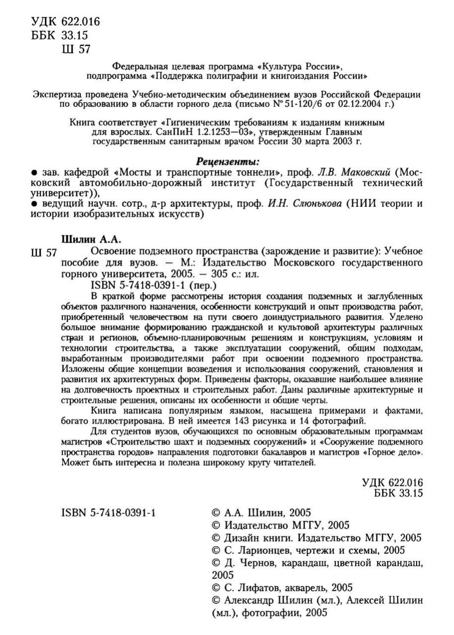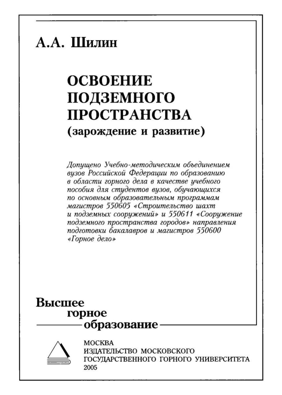 Гриф: Допущено Учебно-методическим обьединением вузов Российской Федерации по образованию в области горного дела в качестве учебного пособия для студентов вузов, обучающихся по основньш образовательньш программам магистров 550605 «Строительство шахт и подземных сооружений» и 550611 «Сооружение подземного пространства городов» направления подготовки бакалавров и магистров 550600 «Горное дело»