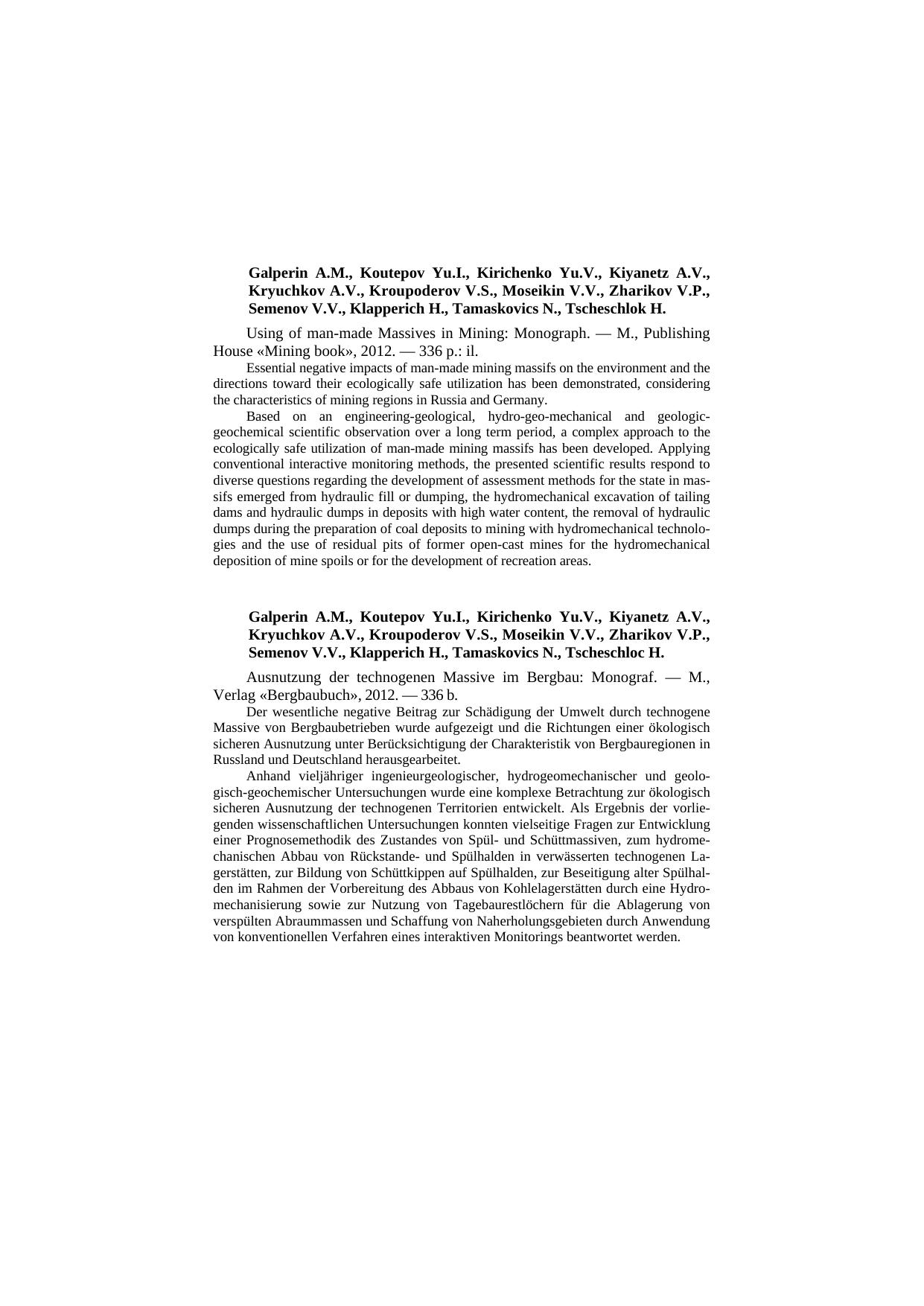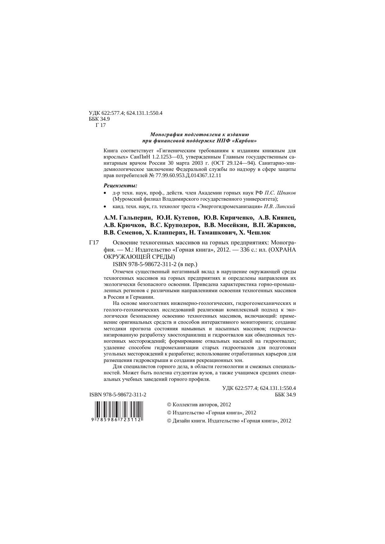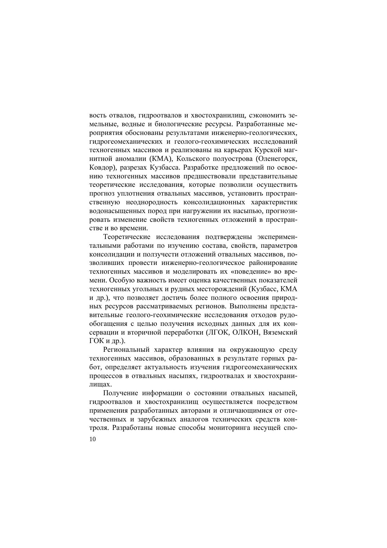 Отмечен существенный негативный вклад в нарушение окружающей среды техногенных массивов на горных предприятиях и определены направления их экологически безопасного освоения. Приведена характеристика горно-промышленных регионов с различными направлениями освоения техногенных массивов в России и Германии. На основе многолетних инженерно-геологических, гидрогеомеханических и геолого-геохимических исследований реализован комплексный подход к экологически безопасному освоению техногенных массивов, включающий: применение оригинальных средств и способов интерактивного мониторинга; создание методики прогноза состояния намывных и насыпных массивов; гидромеханизированную разработку хвостохранилищ и гидроотвалов как обводненных техногенных месторождений; формирование отвальных насыпей на гидроотвалах; удаление способом гидромеханизации старых гидроотвалов для подготовки угольных месторождений к разработке; использование отработанных карьеров для размещения гидровскрыши и создания рекреационных зон. Для специалистов горного дела, в области геоэкологии и смежных специальностей. Может быть полезна студентам вузов, а также учащимся средних специальных учебных заведений горного профиля