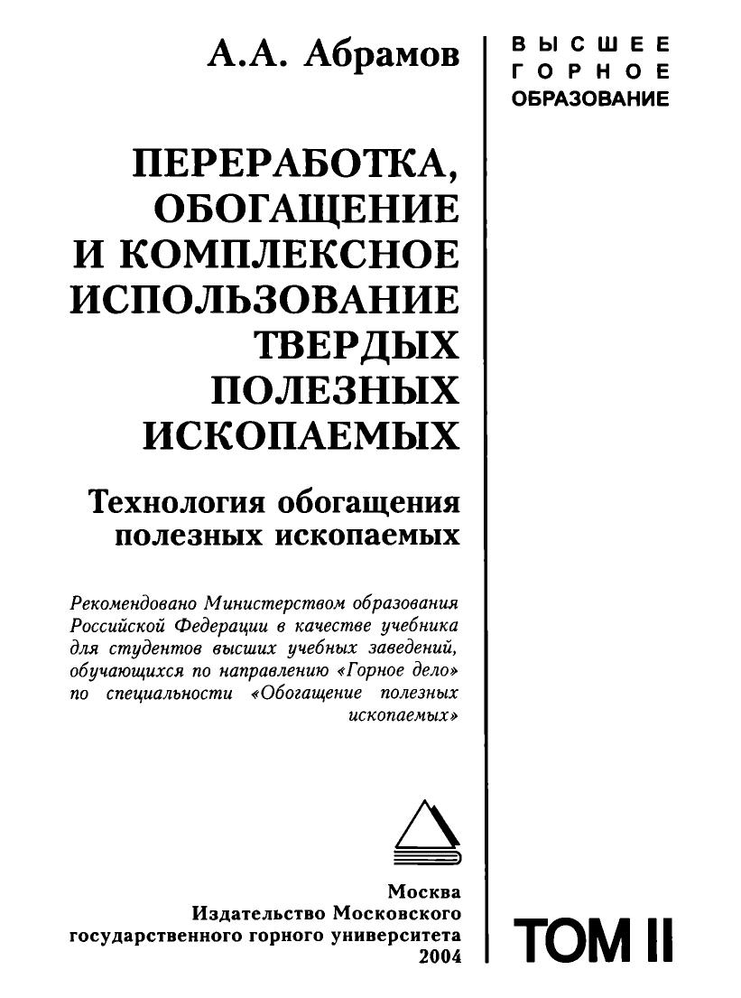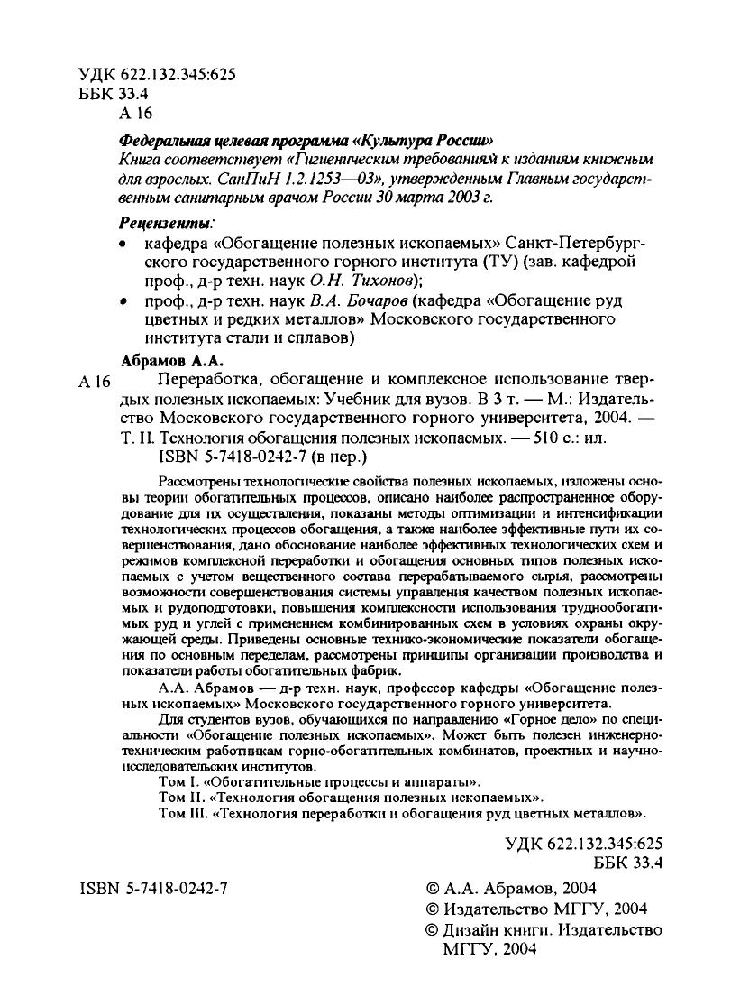 Гриф: Рекомендовано Министерством образования Российской Федерации в качестве учебника для студентов высших учебных заведений, обучающихся по направлению "Горное дело" по специальности "Обогащение полезных ископаемых"