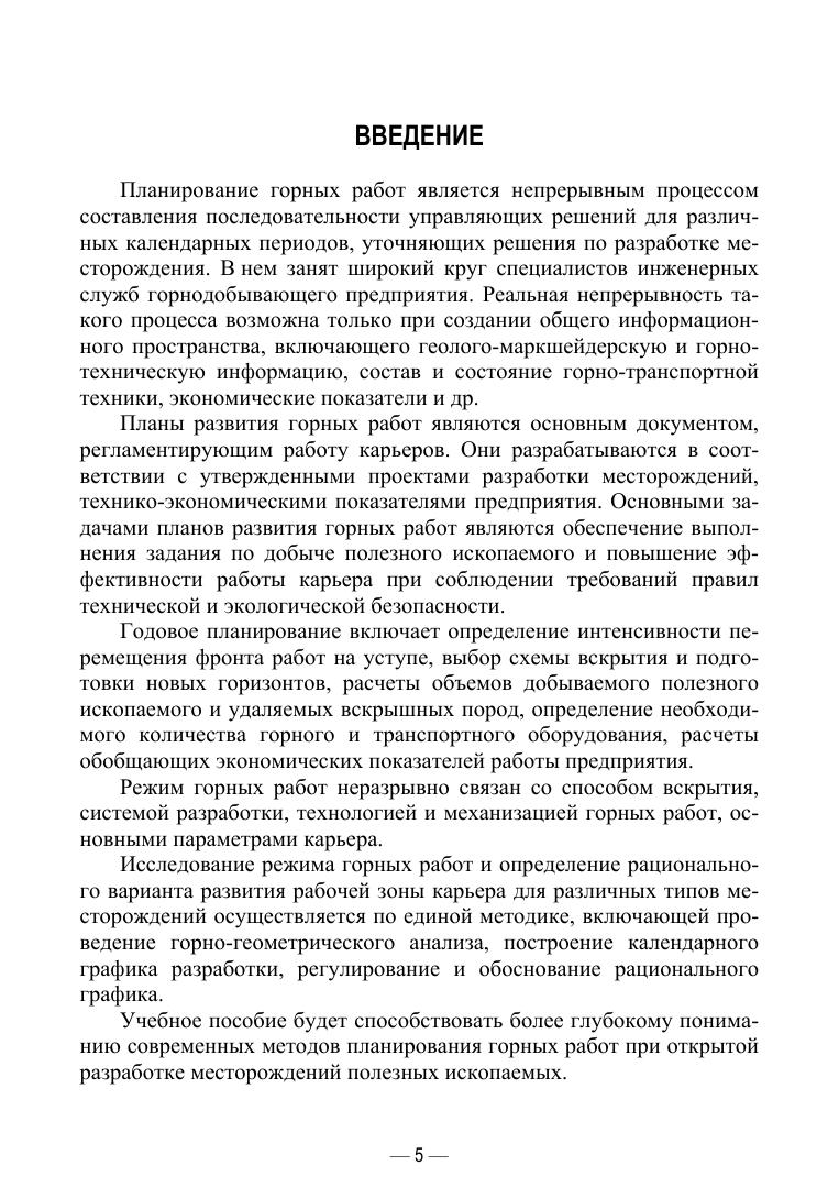 Описаны современные методы планирования горных работ при открытой разработке месторождений. Рассмотрена система планирования горных работ карьеров, содержание плана горных работ, экономические показатели планирования, подготовка, рассмотрение и согласование планов развития горных работ, средства автоматизированного планирования открытых горных работ, понятие о режиме горных работ, стадии развития проекта карьера.Учебное пособие предназначено для студентов высших учебных заведений, обучающихся по специальности «Горное дело», аспирантов научной специальности «Теоретические основы проектирования горнотехнических систем» и слушателей центра ДПО Горного университета.