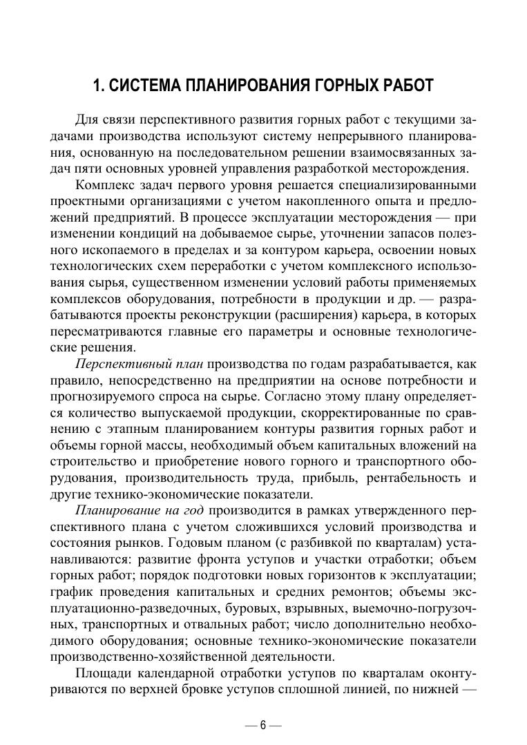 Описаны современные методы планирования горных работ при открытой разработке месторождений. Рассмотрена система планирования горных работ карьеров, содержание плана горных работ, экономические показатели планирования, подготовка, рассмотрение и согласование планов развития горных работ, средства автоматизированного планирования открытых горных работ, понятие о режиме горных работ, стадии развития проекта карьера.Учебное пособие предназначено для студентов высших учебных заведений, обучающихся по специальности «Горное дело», аспирантов научной специальности «Теоретические основы проектирования горнотехнических систем» и слушателей центра ДПО Горного университета.