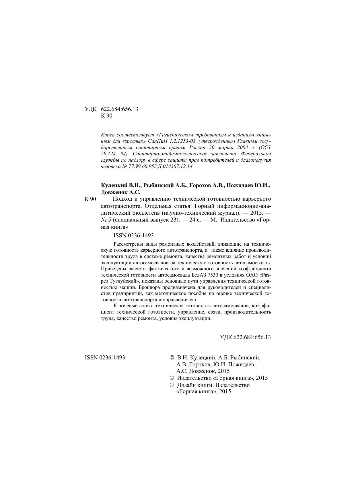 Подход к управлению технической готовностью карьерного автотранспорта. Отдельная статья: Горный информационно-аналитический бюллетень (научно-технический журнал)