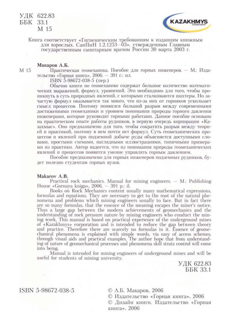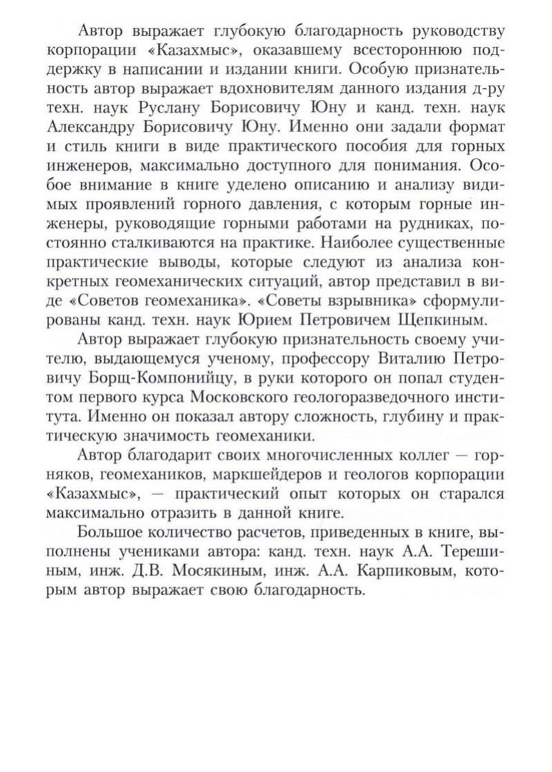 Обычно книги по геомеханике содержат большое количество математических выражений, формул, уравнений. Это необходимо для того, чтобы проникнуть в суть природных явлений, с которыми сталкиваются шахтеры. Но зачастую формул оказывается так много, что из-за них от горняков ускользает смысл процессов. Поэтому появился большой разрыв между современными достижениями геомеханики и уровнем понимания природы горного давления инженерами, которые руководят горными работами. Данное пособие основано на практическом опыте работы рудников, в первую очередь корпорации «Ка-захмыс». Оно предназначено для того, чтобы сократить разрыв между теорией и практикой, поэтому в нем почти нет формул. Суть геомеханических процессов и явлений при подземной добыче руды объясняется доступными словами, простыми схемами, наглядными иллюстрациями, типичными примерами из практики. Автор надеется, что из понимания природы геомеханических явлений и процессов появится умение управлять горным давлением.