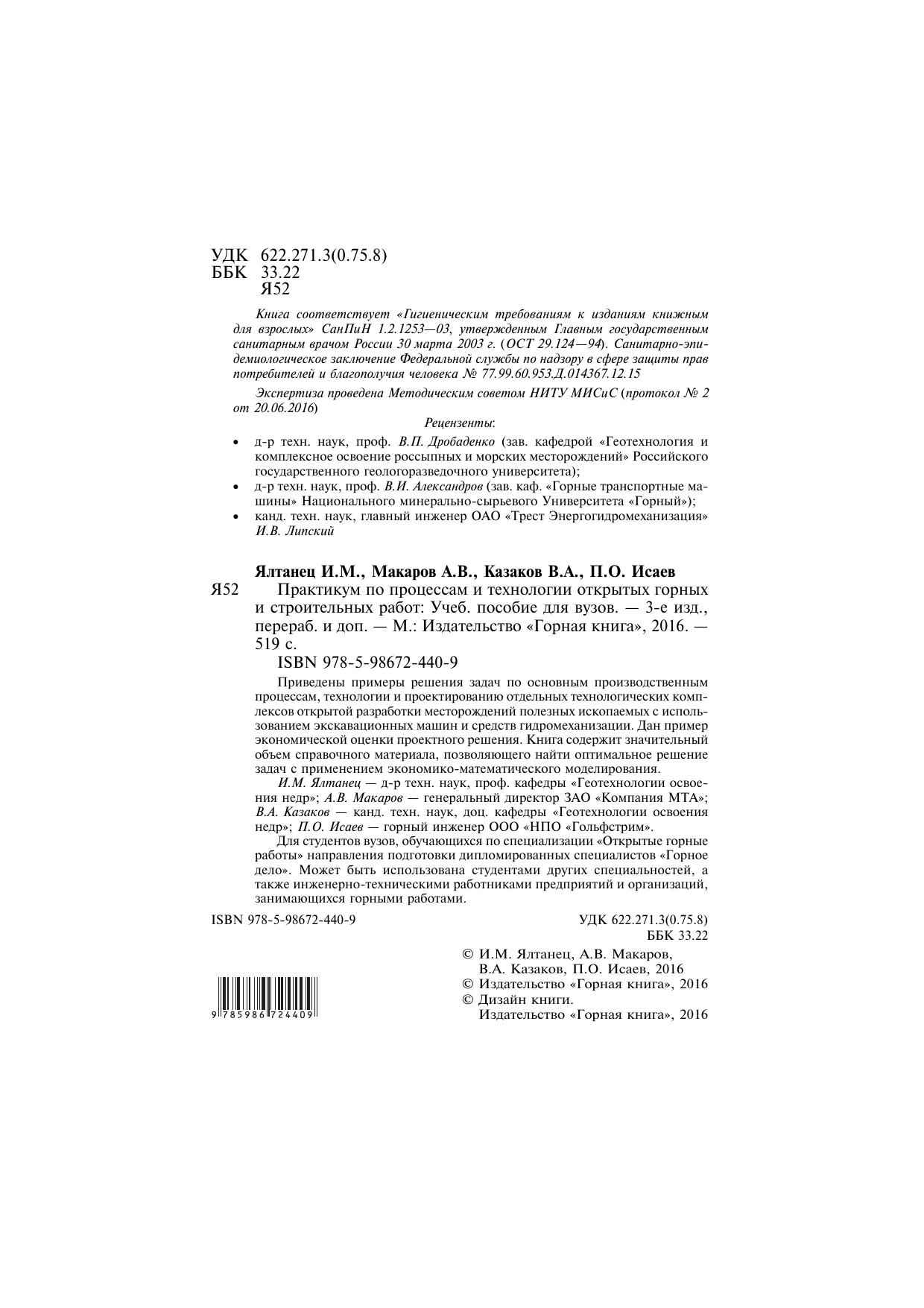 Приведены примеры решения задач по основным производственным процессам, технологии и проектированию отдельных технологических комплексов открытой разработки месторождений полезных ископаемых с использованием экскавационных машин и средств гидромеханизации. Дан пример экономической оценки проектного решения. Книга содержит значительный объем справочного материала, позволяющего найти оптимальное решение задач с применением экономик-математического моделирования. И.М. Ялтанец — д-р техн. наук, проф. кафедры «Геотехнологии освоения недр»; А.В. Макаров — генеральный директор ЗАО «Компания МТА»; В.А. Казаков — канд. техн. наук, доц. кафедры «Геотехнологии освоения недр»; П.О. Исаев — горный инженер ООО «НПО «Гольфстрим».