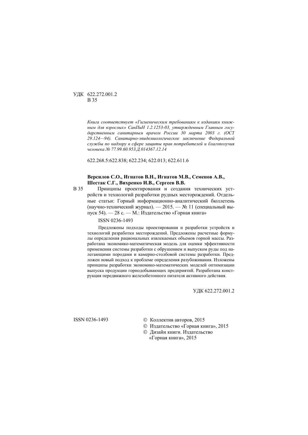 Принципы проектирования и создания технических устройств и технологий разработки рудных месторождений. Отдельные статьи: Горный информационно-аналитический бюллетень (научно-технический журнал)