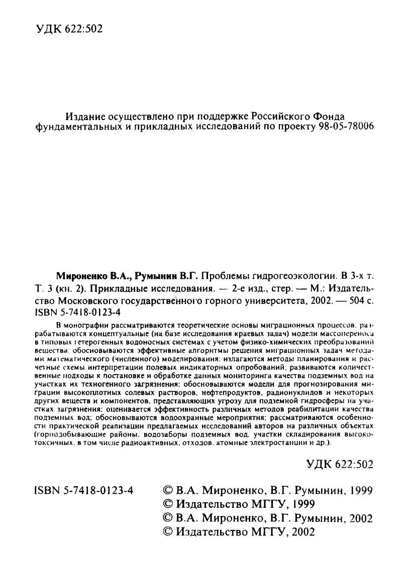 В монографии рассматриваются теоретические основы миграционных процессов, разрабатываются концептуальные (на базе исследования краевых задач) модели массопереноса в типовых гетерогенных водоносных системах с учетом физико-химических преобразований вещества: обосновываются эффективные алгоритмы решения миграционных задач методами математического (численного) моделирования, излагаются методы планирования и четные схемы интерпретации полевых индикаторных опробований, развиваются количественные подходы к постановке и обработке данных мониторинга качества подземных вод на участках их техногенного загрязнения обосновываются модели для прогнозирования миграции высокоплотных солевых растворов, нефтепродуктов, радионуклидов и некоторых других веществ и компонентов, представляющих угрозу для подземной гидросферы на участках загрязнения оценивается эффективность различных методов реабилитации качеств.) подземных вод обосновываются водоохранные мероприятия рассматриваются особенности практической реализации предлагаемых исследований авторов на различных объектах (горнодобывающие районы, водозаборы подземных вод. участки складирования высоко-токсичных, в том числе радиоактивных, отходов, атомные электростанции и др.).