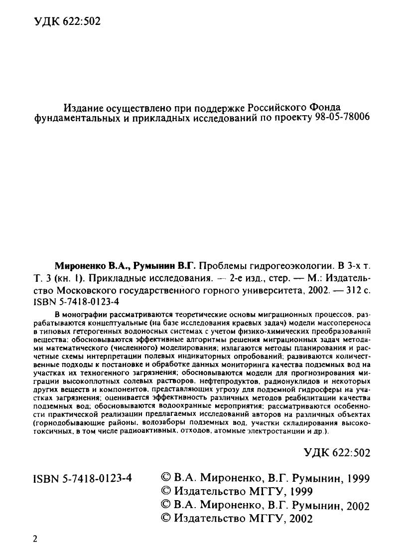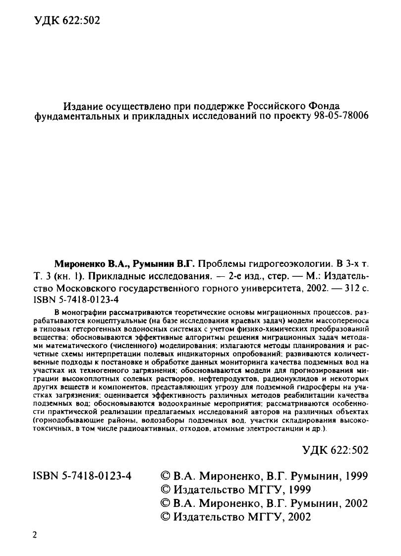 В монографии рассматриваются теоретические основы миграционных процессов, разрабатываются концептуальные (на базе исследования краевых задач) модели массопереноса в типовых гетерогенных водоносных системах с учетом физико-химических преобразований вещества: обосновываются эффективные алгоритмы решения миграционных задач методами математического (численного) моделирования, излагаются методы планирования и четные схемы интерпретации полевых индикаторных опробований, развиваются количественные подходы к постановке и обработке данных мониторинга качества подземных вод на участках их техногенного загрязнения обосновываются модели для прогнозирования миграции высокоплотных солевых растворов, нефтепродуктов, радионуклидов и некоторых других веществ и компонентов, представляющих угрозу для подземной гидросферы на участках загрязнения оценивается эффективность различных методов реабилитации качеств.) подземных вод обосновываются водоохранные мероприятия рассматриваются особенности практической реализации предлагаемых исследований авторов на различных объектах (горнодобывающие районы, водозаборы подземных вод. участки складирования высоко-токсичных, в том числе радиоактивных, отходов, атомные электростанции и др.).