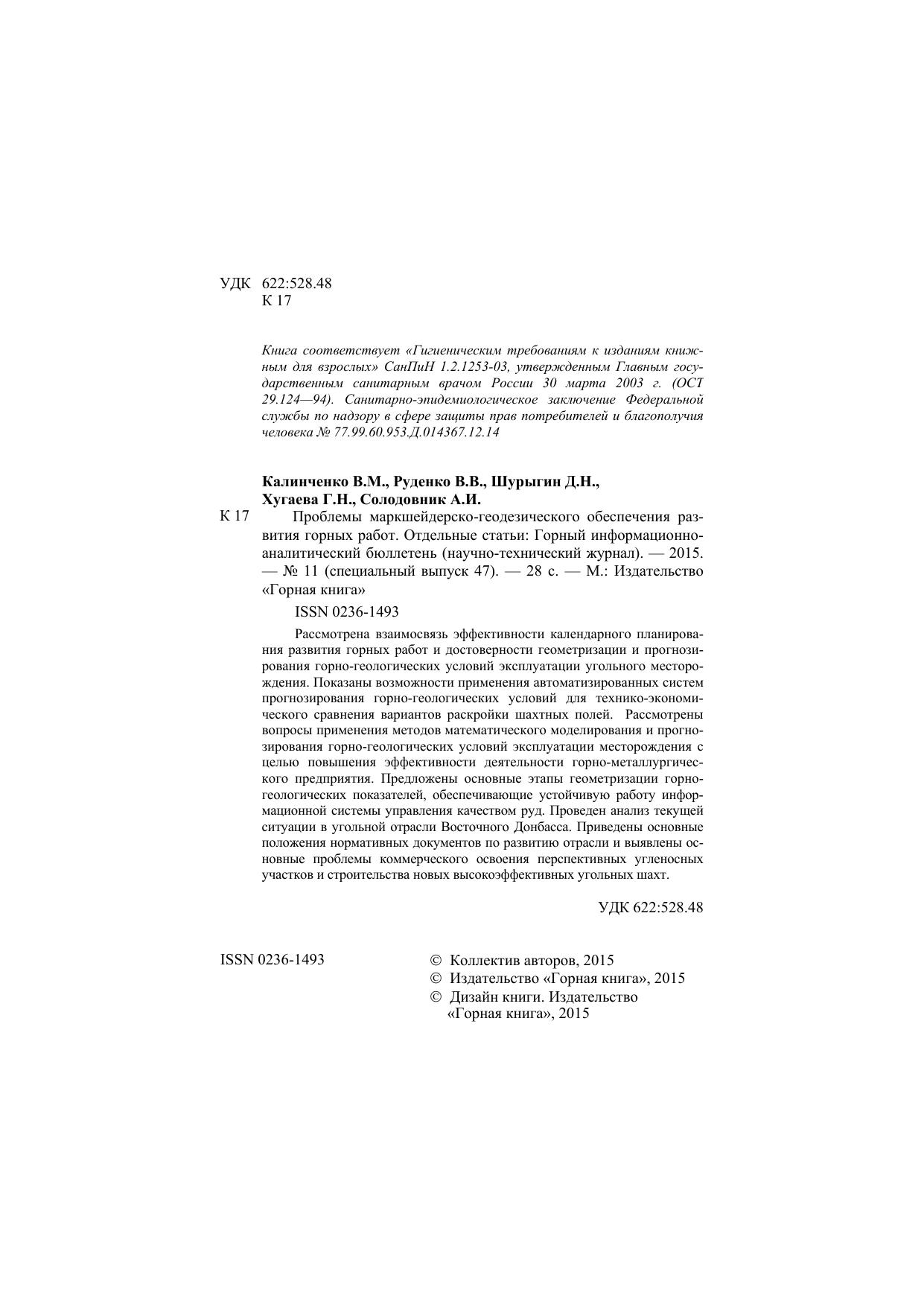Проблемы маркшейдерско-геодезического обеспечения развития горных работ. Отдельные статьи: Горный информационно-аналитический бюллетень (научно-технический журнал)