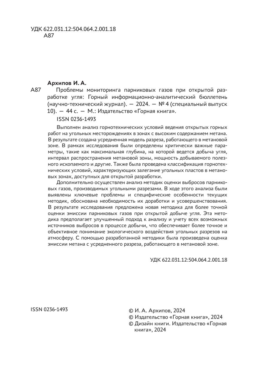 Проблемы мониторинга парниковых газов при открытой разработке угля: горный информационно-аналитический бюллетень № 4. Специальный выпуск 10