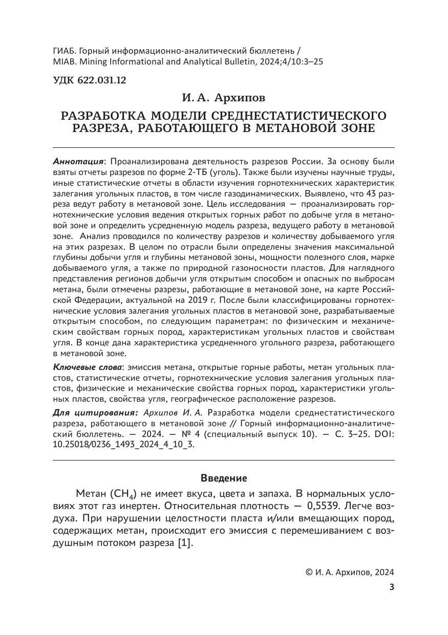Выполнен анализ горнотехнических условий ведения открытых горных работ на угольных месторождениях в зонах с высоким содержанием метана. В результате создана усредненная модель разреза, работающего в метановой зоне. В рамках исследования были определены критически важные параметры, такие как максимальная глубина, на которой ведется добыча угля, интервал распространения метановой зоны, мощность добываемого полезного ископаемого и другие. Также была проведена классификация горнотехнических условий, характеризующих залегание угольных пластов в метановых зонах, доступных для открытой разработки.