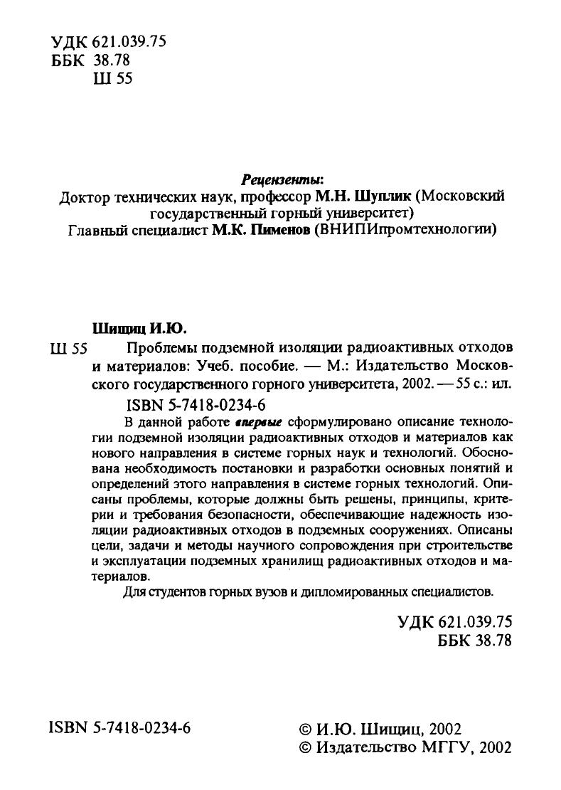 В данной работе впервые сформулировано описание технологии подземной изоляции радиоактивных отходов и материалов как нового направления в системе горных наук и технологий. Обоснована необходимость постановки и разработки основных понятий и определений этого направления в системе горных технологий. Описаны проблемы, которые должны быть решены, принципы, критерии и требования безопасности, обеспечивающие надежность изоляции радиоактивных отходов в подземных сооружениях. Описаны цели, задачи и методы научного со-провождения при строительстве и эксплуатации подземных хранилищ радиоактивных отходов и материалов. Для студентов горных вузов и дипломированных специалистов.