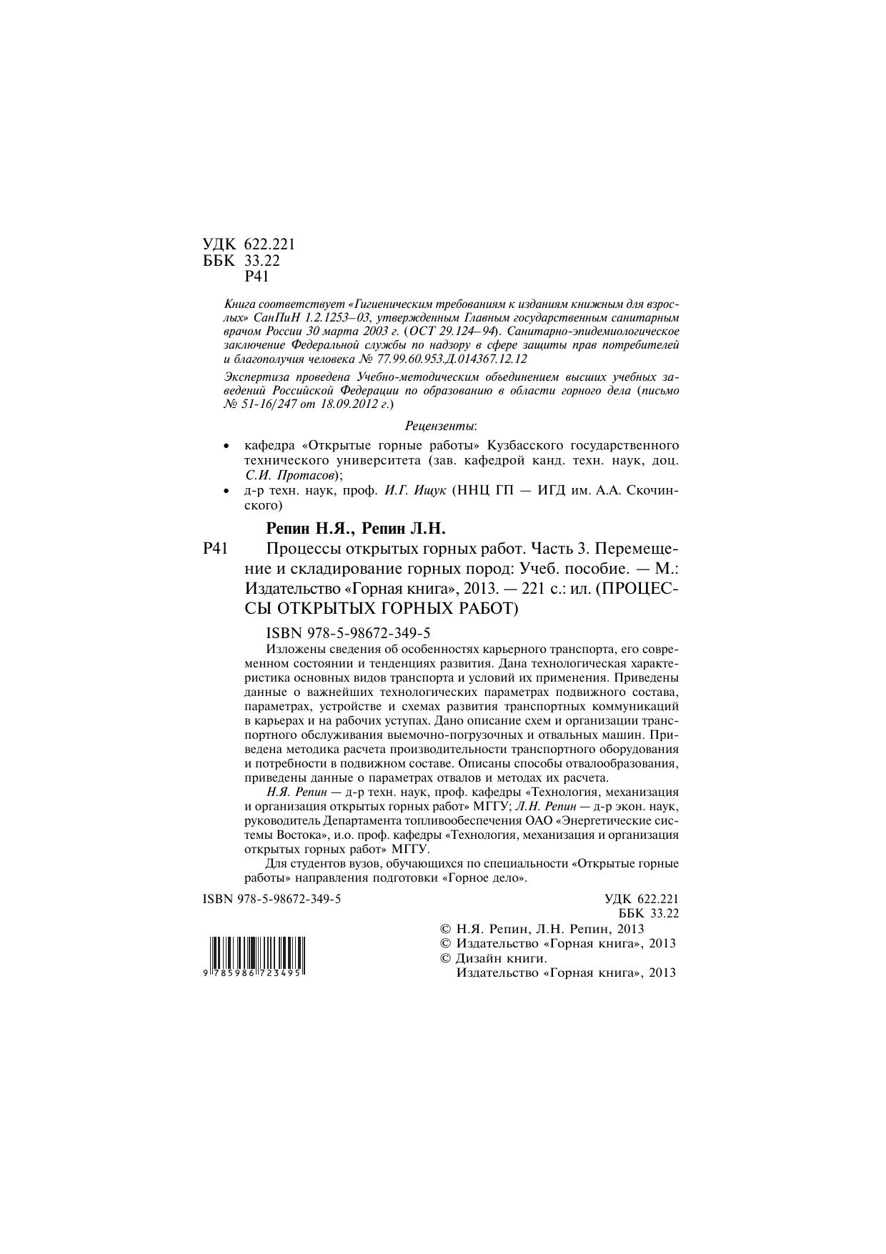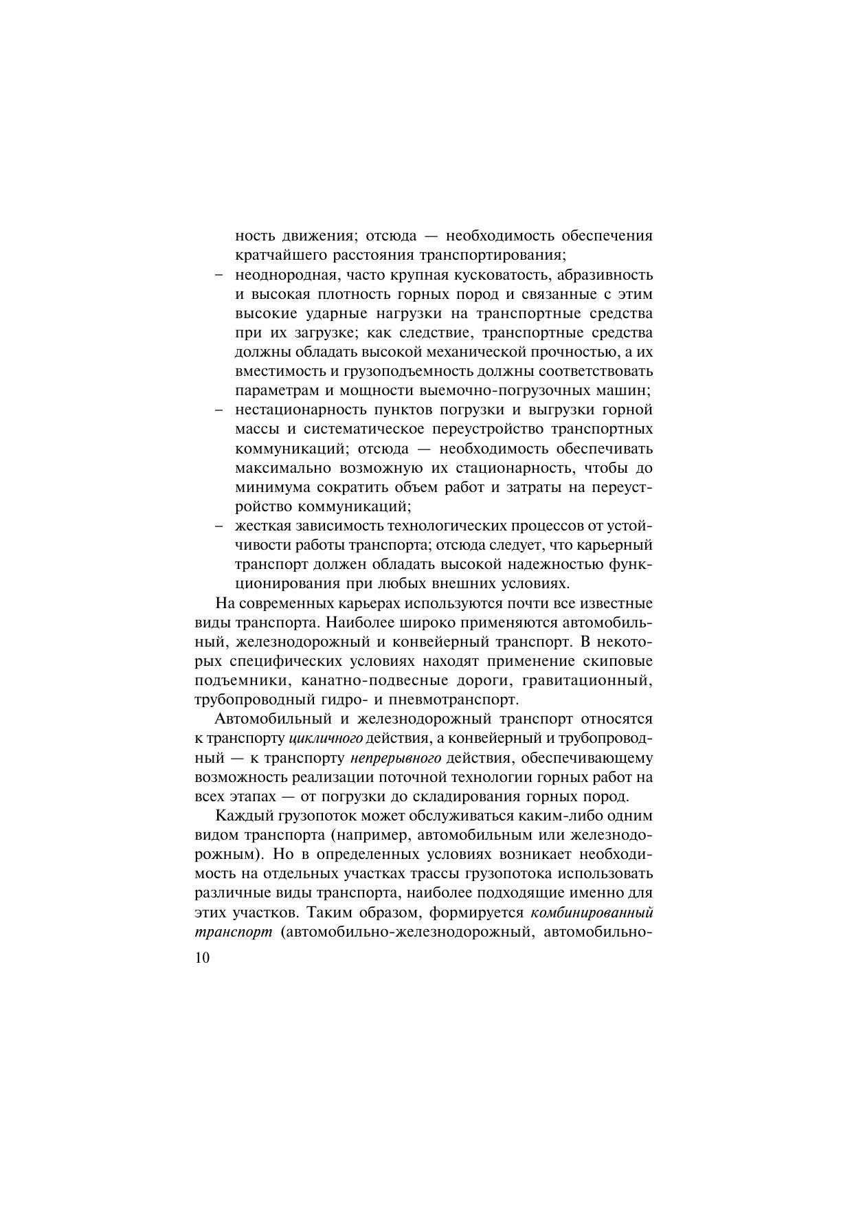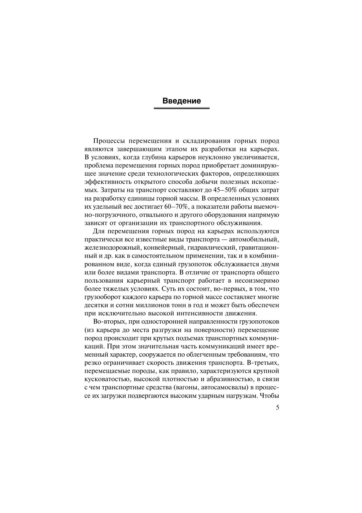 Изложены сведения об особенностях карьерного транспорта, его современном состоянии и тенденциях развития. Дана технологическая характеристика основных видов транспорта и условий их применения. Приведены данные о важнейших технологических параметрах подвижного состава, параметрах, устройстве и схемах развития транспортных коммуникаций в карьерах и на рабочих уступах. Дано описание схем и организации транспортного обслуживания выемочно-погрузочных и отвальных машин. Приведена методика расчета производительности транспортного оборудования и потребности в подвижном составе. Описаны способы отвалообразования, приведены данные о параметрах отвалов и методах их расчета. Н.Я. Репин — д-р техн. наук, проф. кафедры «Технология, механизация и организация открытых горных работ» МГГУ; Л.Н. Репин — д-р экон. наук, руководитель Департамента топливообеспечения ОАО «Энергетические системы Востока», и.о. проф. кафедры «Технология, механизация и организация открытых горных работ» МГГУ. Для студентов вузов, обучающихся по специальности «Открытые горные работы» направления подготовки «Горное дело».