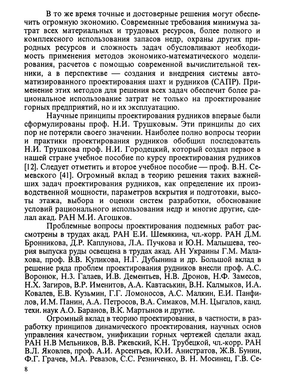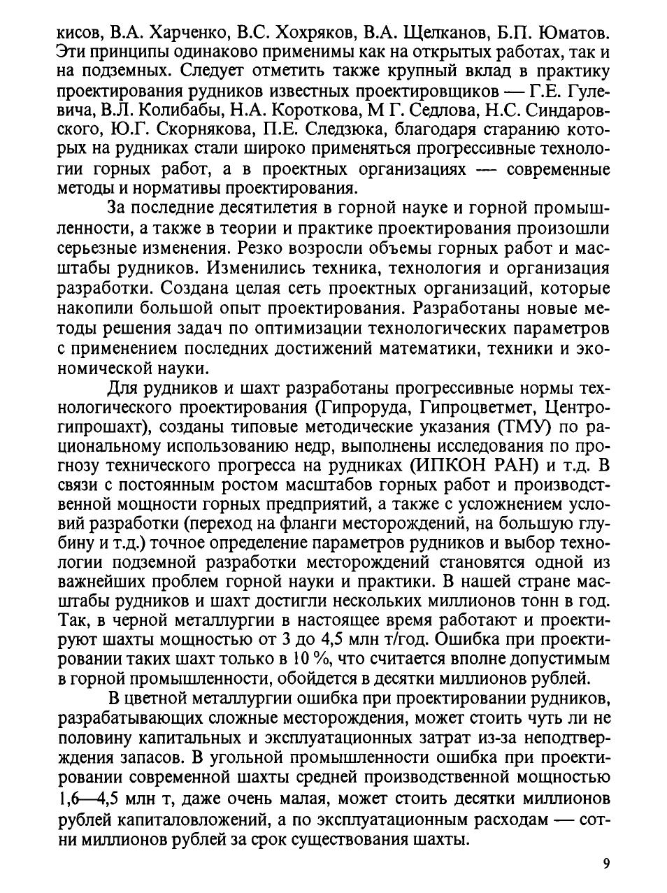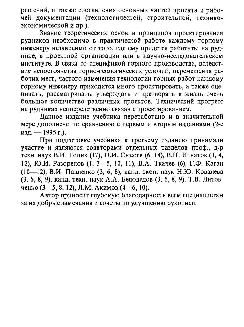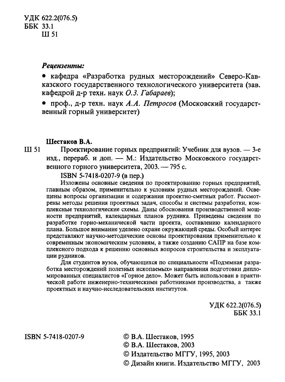 Изложены основные сведения по проектированию горных предприятий, главным образом, применительно к условиям рудных месторождений. Освещены вопросы организации и содержания проектно-сметных работ. Рассмотрены методы решения проектных задач, способы и системы разработки, комплексные технологические схемы. Даны обоснования производственной мощности предприятий, календарных планов рудника. Приведены сведения по разработке горно-механической части проекта, составлению календарного плана. Большое внимание уделено охране окружающей среды. Особый интерес представляют научно-методические основы проектирования применительно к современным экономическим условиям, а также созданию САПР на базе комплексного подхода к решению основных вопросов строительства и эксплуатации рудников. Для студентов вузов, обучающихся по специальности «Подземная разработка месторождений полезных ископаемых» направления подготовки дипломированных специалистов «Горное дело». Может быть использован в практической работе инженерно-техническими работниками производства, а также проектных и научно-исследовательских институтов.