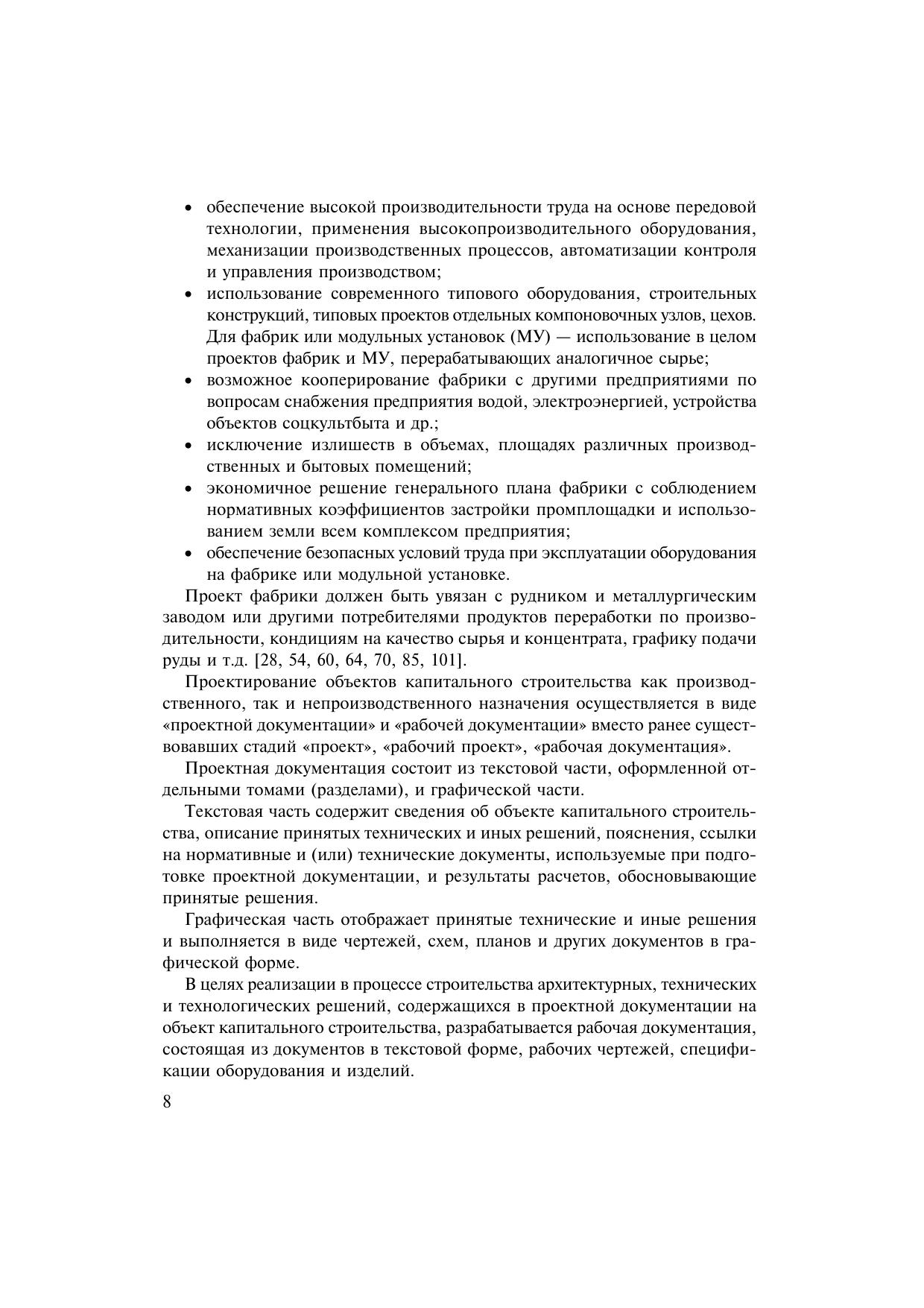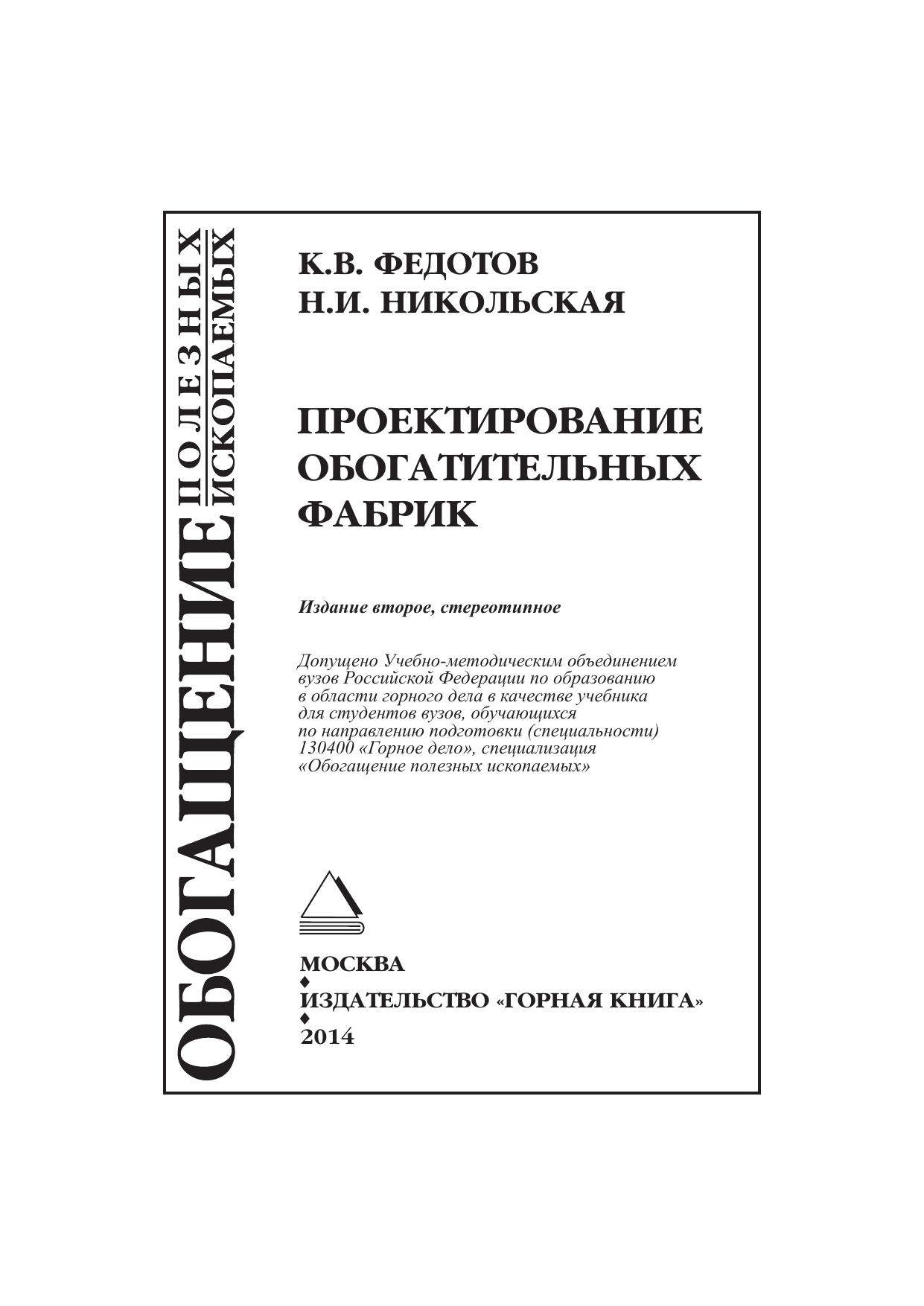 Изложены требования к проекту обогатительной фабрики, последовательность операций при проектировании производственного цикла переработки твердых полезных ископаемых. Приведены сравнительные методы расчета качественно-количественных схем, схемы рудоподготовки и измельчения, классификации и обезвоживания, принципы выбора типа аппаратов для каждой операции. Даны примеры по размещению оборудования в цехах и отделениях, приведены основные параметры и компоновка зданий, транспортные схемы рудного потока и продуктов сепарации. Рассмотрен комплекс вопросов, определяющих экономику горно-обогатительного производства. К.В. Федотов — д-р техн. наук, профессор, зав. кафедрой «Обогащение полезных ископаемых и инженерная экология» Национального исследовательского Иркутского государственного технического университета (НИ ИрГТУ); Н.И. Никольская — канд. техн. наук, профессор этой же кафедры. Для студентов вузов, обучающихся по направлению подготовки (специальности) 130400 «Горное дело», специализация «Обогащение полезных ископаемых».