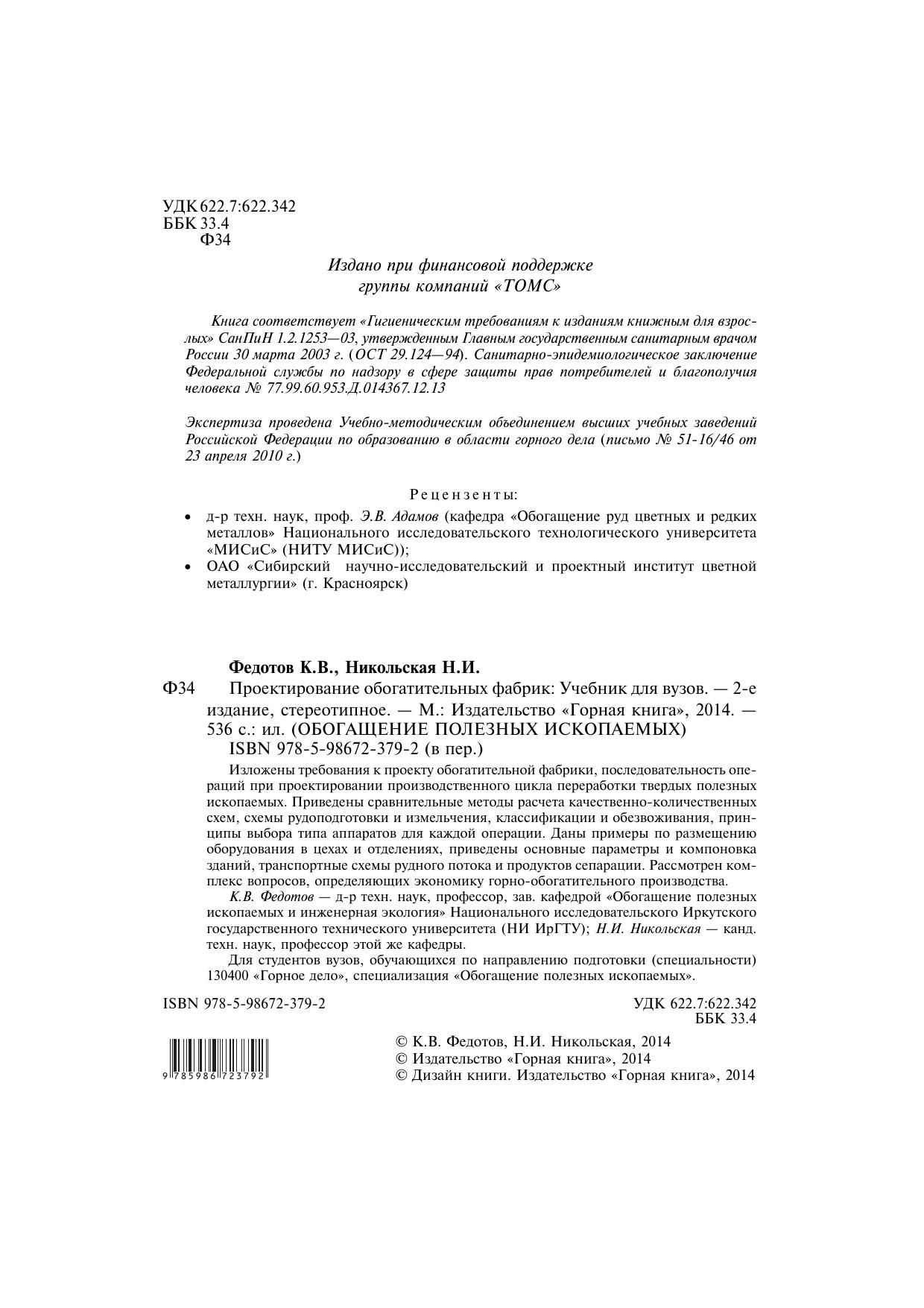 Гриф: Допущено Учебно-методическим объединением вузов Российской Федерации по образованию в области горного дела в качестве учебника для студентов вузов, обучающихся по направлению подготовки (специальности) 130400 «Горное дело», специализация «Обогащение полезных ископаемых»