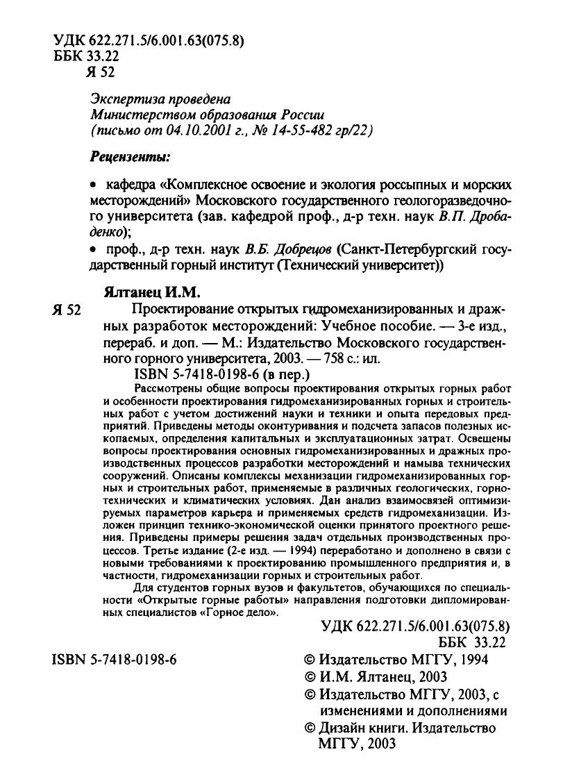 Проектирование открытых гидромеханизированных и дражных разработок месторождений