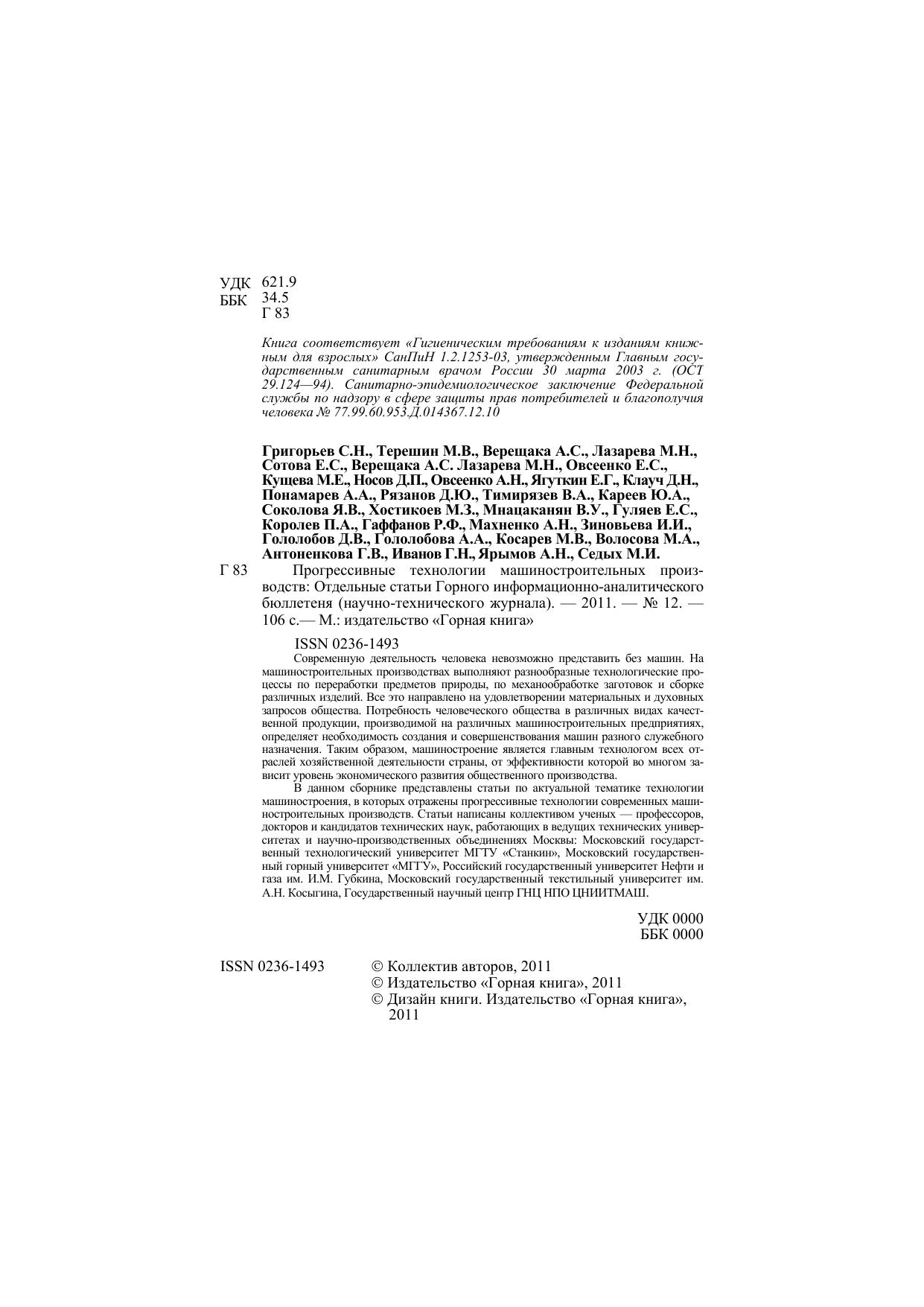 Современную деятельность человека невозможно представить без машин. На машиностроительных производствах выполняют разнообразные технологические процессы по переработки предметов природы, по механообработке заготовок и сборкеразличных изделий. Все это направлено на удовлетворении материальных и духовных запросов общества. Потребность человеческого общества в различных видах качественной продукции, производимой на различных машиностроительных предприятиях, определяет необходимость создания и совершенствования машин разного служебного назначения. Таким образом, машиностроение является главным технологом всех отраслей хозяйственной деятельности страны, от эффективности которой во многом зависит уровень экономического развития общественного производства. В данном сборнике представлены статьи по актуальной тематике технологии машиностроения, в которых отражены прогрессивные технологии современных машиностроительных производств. Статьи написаны коллективом ученых — профессоров, докторов и кандидатов технических наук, работающих в ведущих технических университетах и научно-производственных объединениях Москвы: Московский государственный технологический университет МГТУ «Станкин», Московский государственный горный университет «МГГУ», Российский государственный университет Нефти и газа им. И.М. Губкина, Московский государственный текстильный университет им. А.Н. Косыгина, Государственный научный центр ГНЦ НПО ЦНИИТМАШ