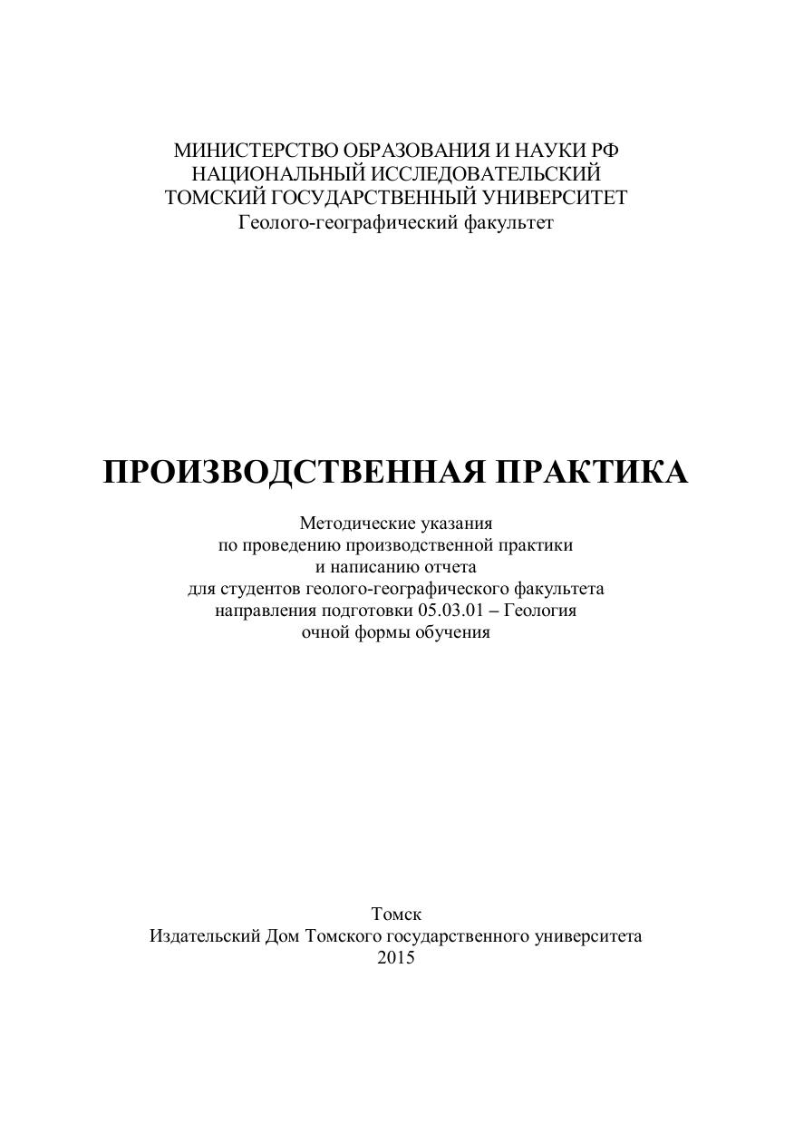 Методические указания по проведению производственной практики и написанию отчета составлены с учетом требований федерального государственного образовательного стандарта высшего образования по направлению подготовки 05.03.01 – Геология (уровень бакалавриата) (приказ Минобрнауки России № 954 от 07.08.2014 г.). В основу методических указаний положены инструкции по организации и проведению геолого-съемочных работ и составлению Государственных геологических карт нового поколения, а также многолетний опыт проведения производственных практик в Томском государственном университете. Для преподавателей, руководителей практики от организаций и студентов.