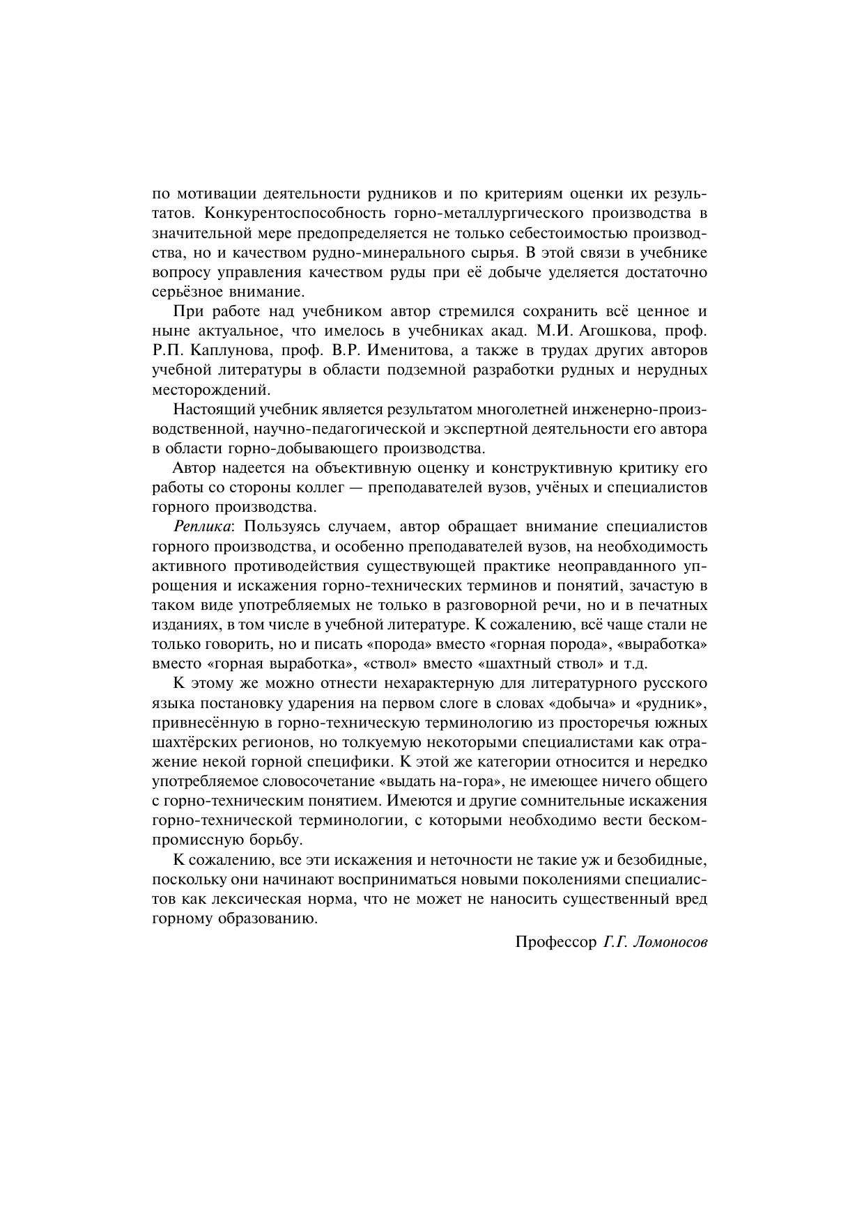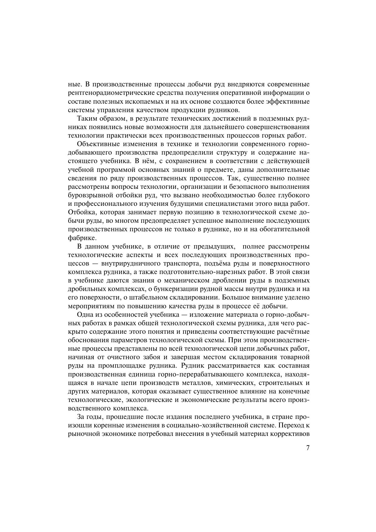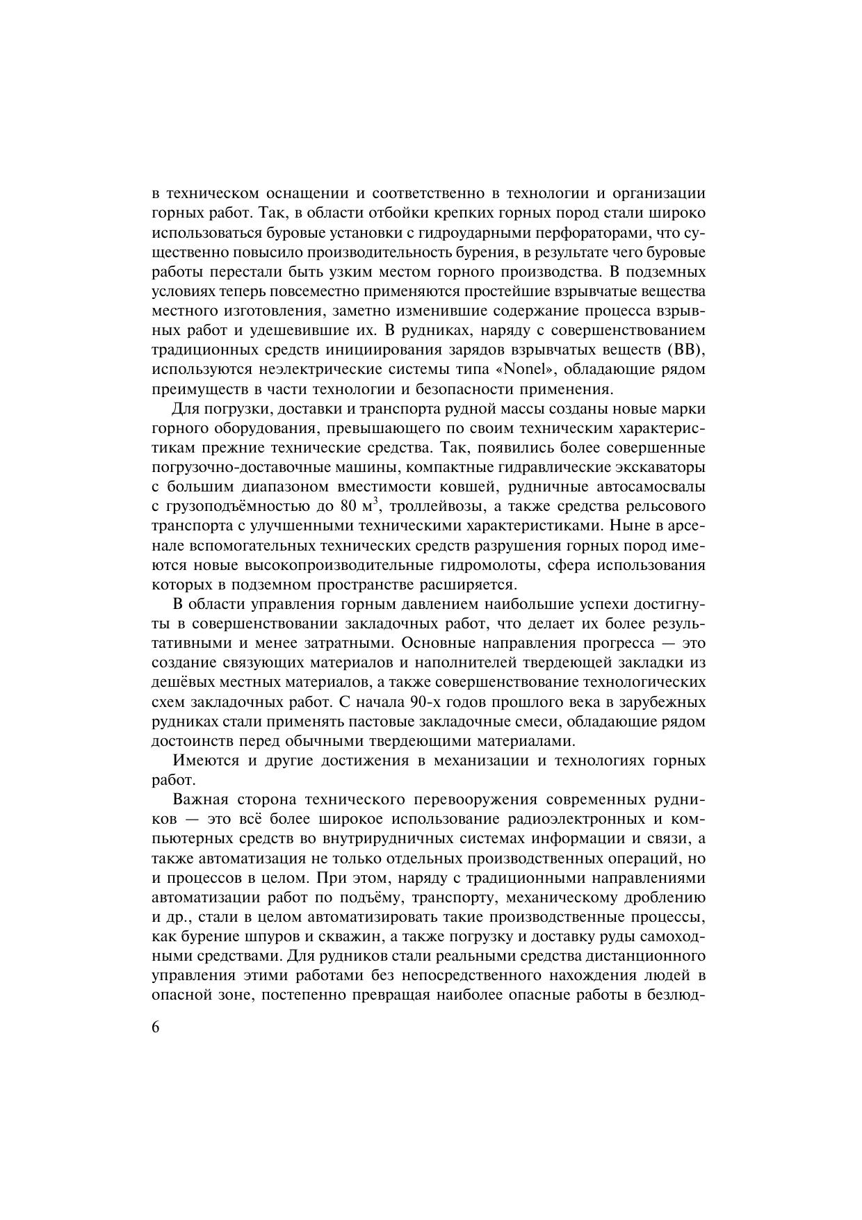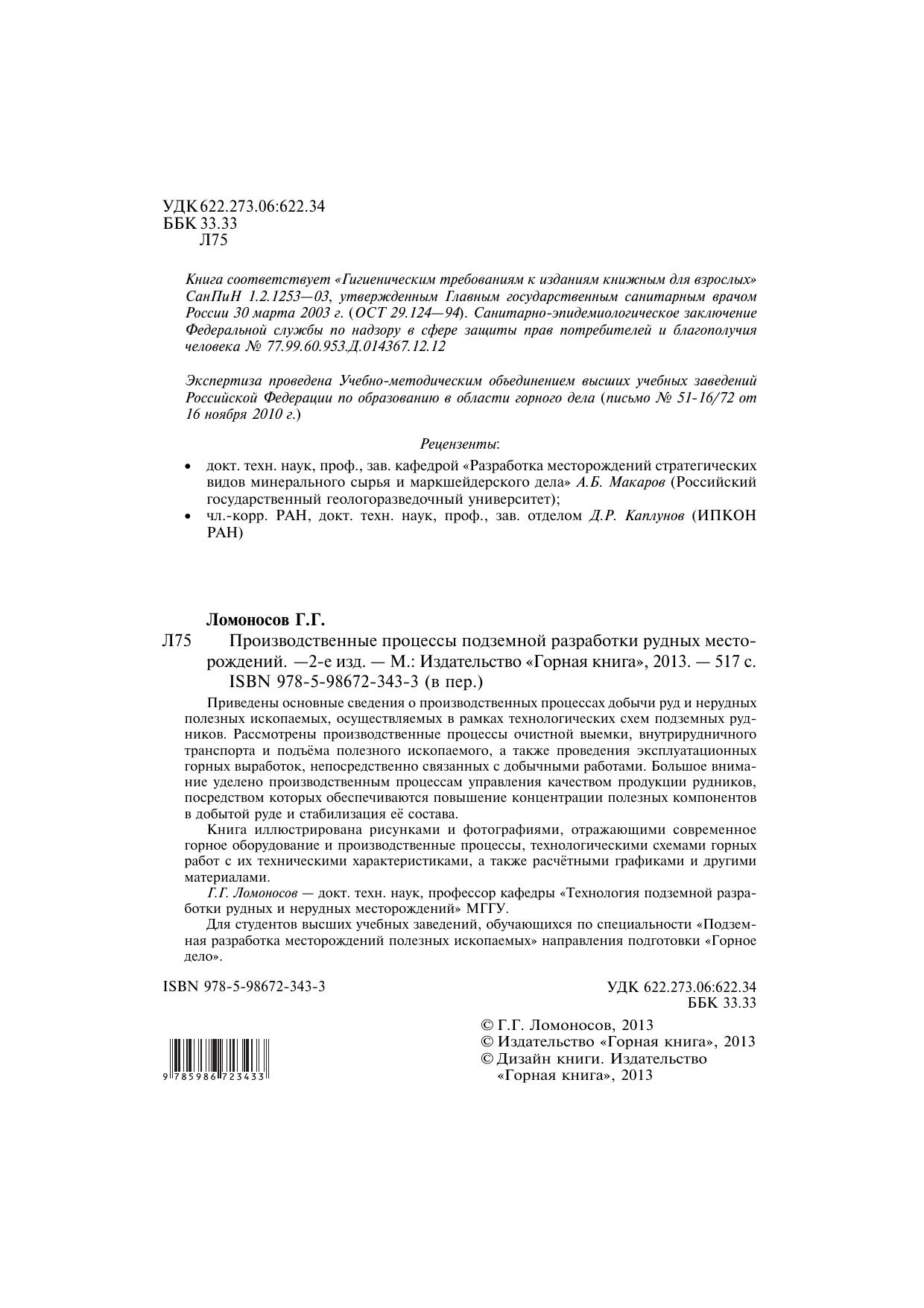 Приведены основные сведения о производственных процессах добычи руд и нерудных полезных ископаемых, осуществляемых в рамках технологических схем подземных рудников. Рассмотрены производственные процессы очистной выемки, внутрирудничного транспорта и подъёма полезного ископаемого, а также проведения эксплуатационных горных выработок, непосредственно связанных с добычными работами. Большое внимание уделено производственным процессам управления качеством продукции рудников, посредством которых обеспечиваются повышение концентрации полезных компонентов в добытой руде и стабилизация её состава. Книга иллюстрирована рисунками и фотографиями, отражающими современное горное оборудование и производственные процессы, технологическими схемами горных работ с их техническими характеристиками, а также расчётными графиками и другими материалами. Г.Г. Ломоносов — докт. техн. наук, профессор кафедры «Технология подземной разработки рудных и нерудных месторождений» МГГУ. Для студентов высших учебных заведений, обучающихся по специальности «Подземная разработка месторождений полезных ископаемых» направления подготовки «Горное дело».