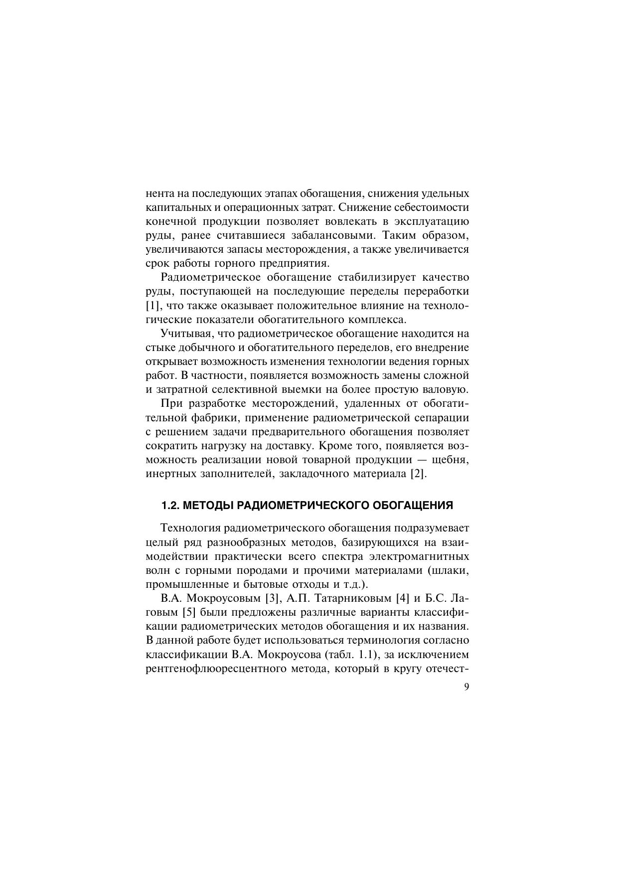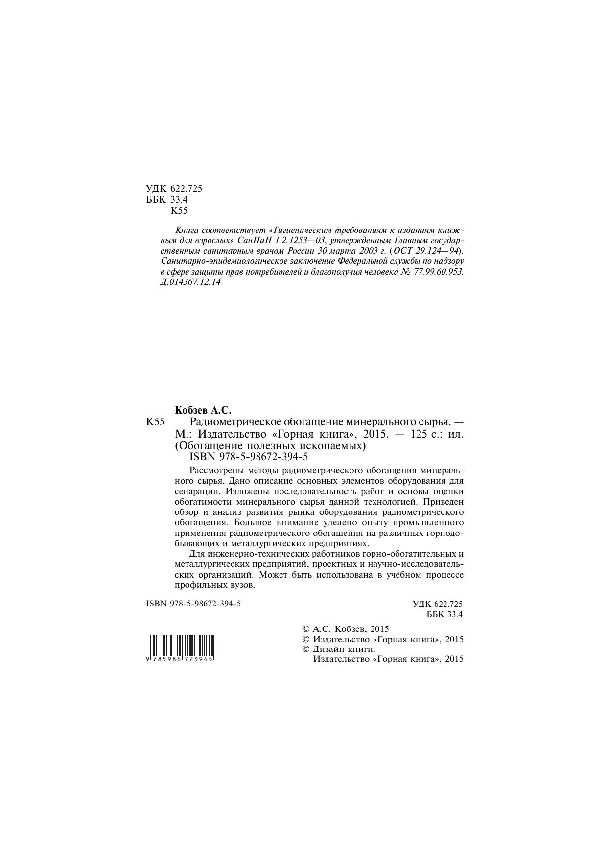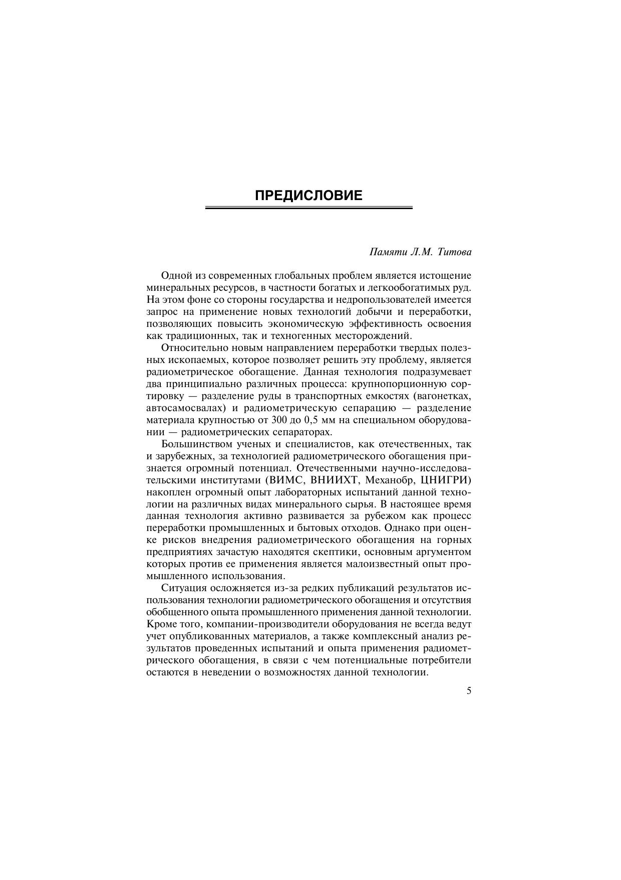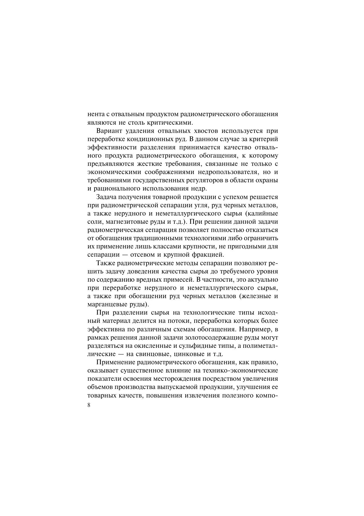 Рассмотрены методы радиометрического обогащения минерального сырья. Дано описание основных элементов оборудования для сепарации. Изложены последовательность работ и основы оценки обогатимости минерального сырья данной технологией. Приведен обзор и анализ развития рынка оборудования радиометрического обогащения. Большое внимание уделено опыту промышленного применения радиометрического обогащения на различных горнодобывающих и металлургических предприятиях. Для инженерно-технических работников горно-обогатительных и металлургических предприятий, проектных и научно-исследовательских организаций. Может быть использована в учебном процессе профильных вузов.