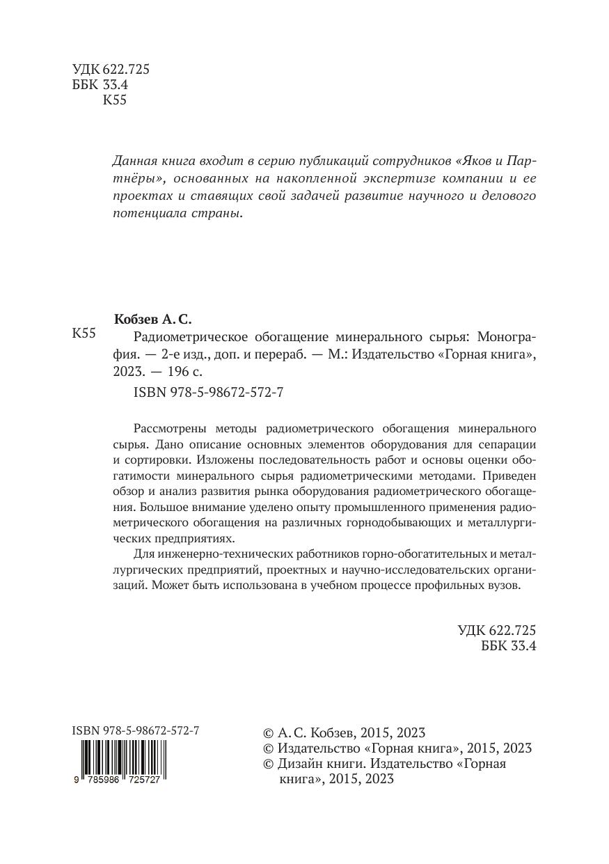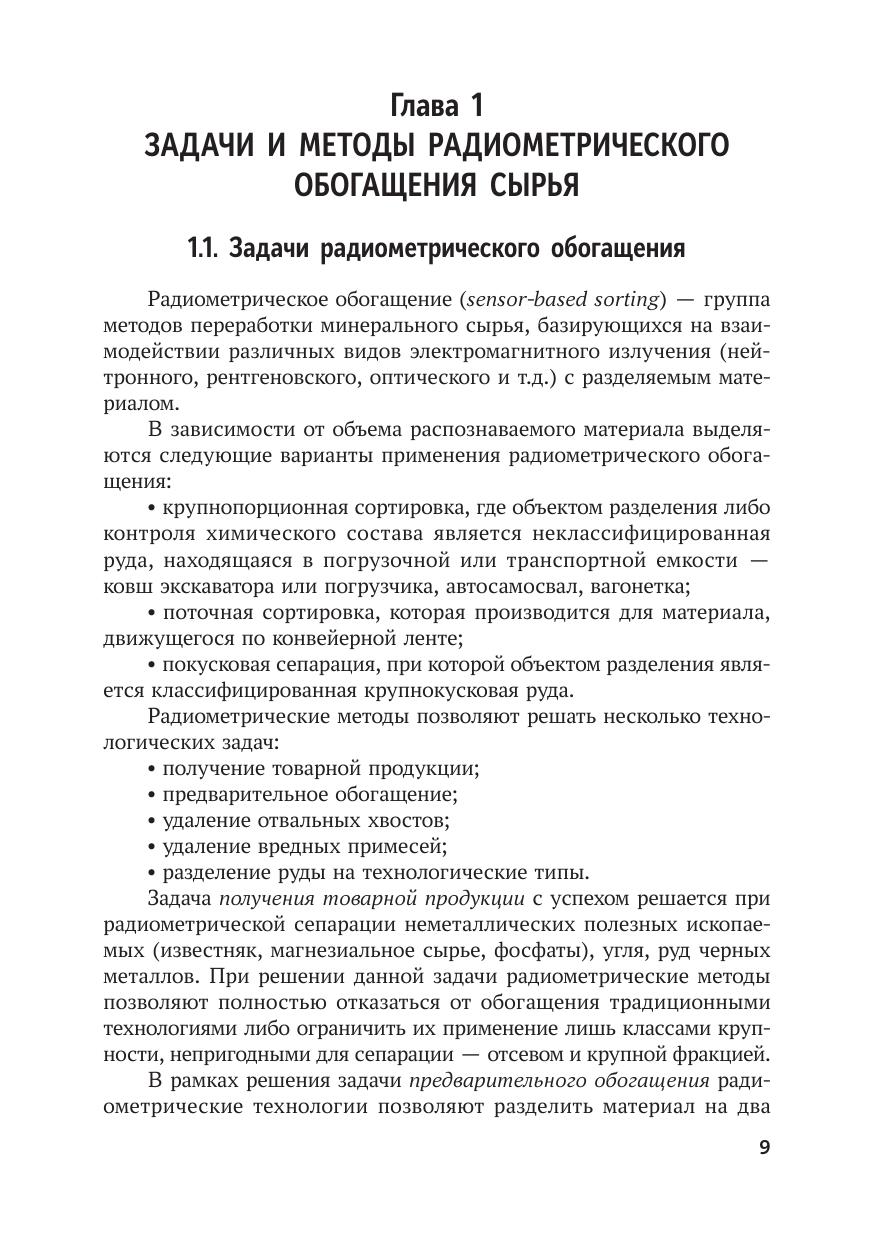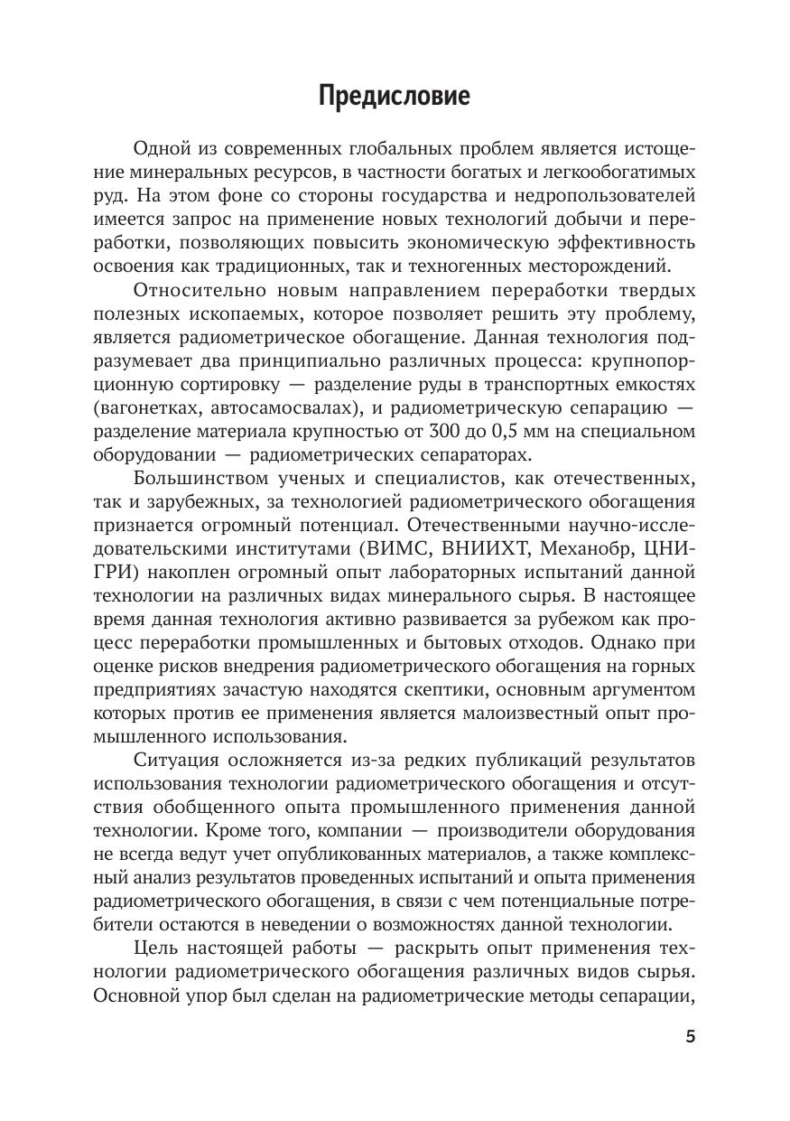 Рассмотрены методы радиометрического обогащения минерального сырья. Дано описание основных элементов оборудования для сепарации и сортировки. Изложены последовательность работ и основы оценки обогатимости минерального сырья радиометрическими методами. Приведен обзор и анализ развития рынка оборудования радиометрического обогащения. Большое внимание уделено опыту промышленного применения радиометрического обогащения на различных горнодобывающих и металлургических предприятиях. Для инженерно-технических работников горно-обогатительных и металлургических предприятий, проектных и научно-исследовательских организаций. Может быть использована в учебном процессе профильных вузов.