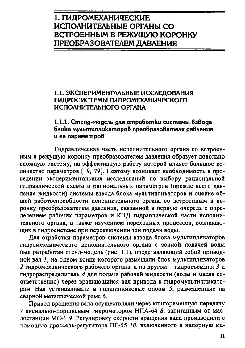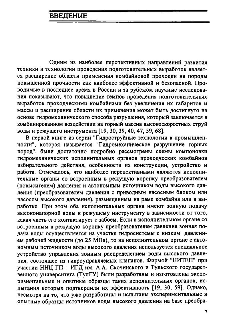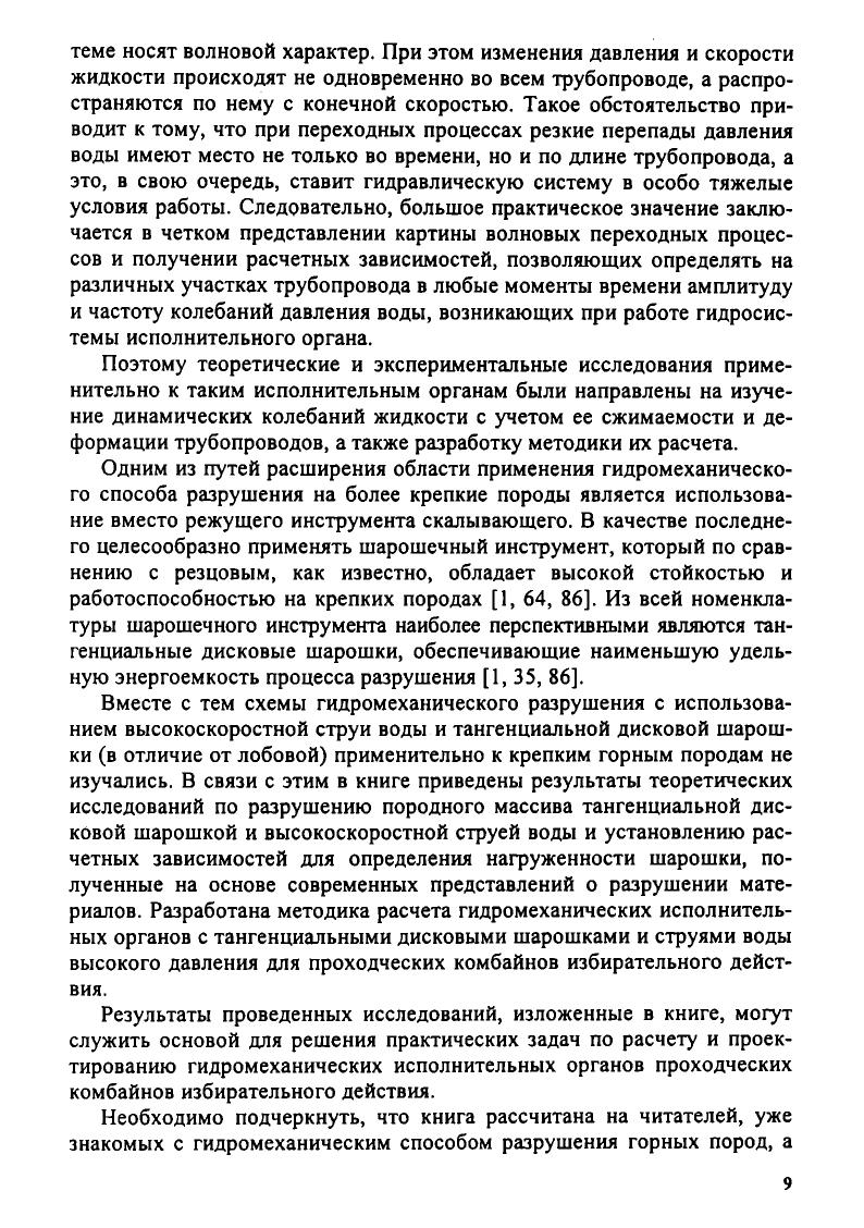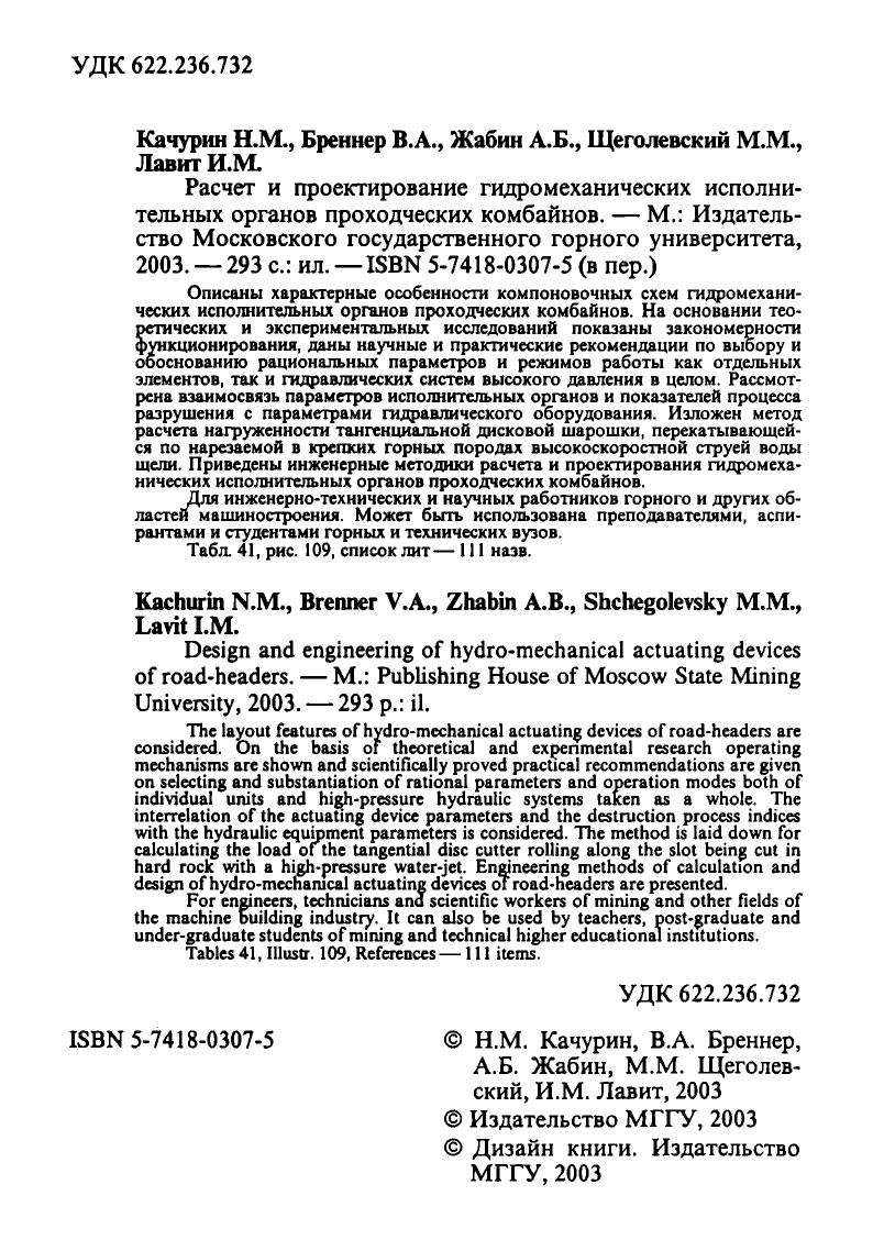 Описаны характерные особенности компоновочных схем гидромеханических исполнительных органов проходческих комбайнов. На основании теоретических и экспериментальных исследований показаны закономерности функционирования, даны научные и практические рекомендации по выбору и обоснованию рациональных параметров и режимов работы как отдельных элементов, так и гидравлических систем высокого давления в целом. Рассмотрена взаимосвязь параметров исполнительных органов и показателей процесса разрушения с параметрами гидравлического оборудования. Изложен метод расчета нагруженности тангенциальной дисковой шарошки, перекатывающейся по нарезаемой в крепких горных породах высокоскоростной струей воды щели. Приведены инженерные методики расчета и проектирования гидромеханических исполнительных органов проходческих комбайнов.