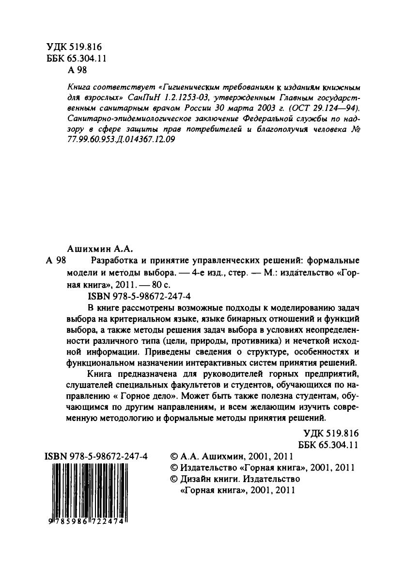 В книге рассмотрены возможные подходы к моделированию задач выбора на критериальном языке, языке бинарных отношений и функций выбора, а также методы решения задач выбора в условиях неопределенности различного типа (цели, природы, противника) и нечеткой исходной информации. Приведены сведения о структуре, особенностях и функциональном назначении интерактивных систем принятия решений. Книга предназначена для руководителей горных предприятий, слушателей специальных факультетов и студентов, обучающихся по направлению « Горное дело». Может быть также полезна студентам, обучающимся по другим направлениям, и всем желающим изучить современную методологию и формальные методы принятия решений.