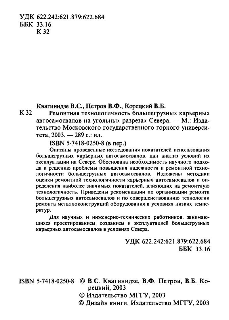 Описаны проведенные исследования показателей использования большегрузных карьерных автосамосвалов, дан анализ условий их эксплуатации на Севере. Обоснована необходимость научного подхода к решению проблемы повышения надежности и ремонтной технологичности большегрузных автосамосвалов. Изложены методики оценки ремонтной технологичности карьерных автосамосвалов и определения наиболее значимых показателей, влияющих на ремонтную технологичность. Приведены рекомендации по организации ремонта большегрузных автосамосвалов и по совершенствованию технологии ремонта металлоконструкций оборудования в условиях низких температур. Для научных и инженерно-технических работников, занимающихся проектированием, созданием и эксплуатацией большегрузных карьерных автосамосвалов в условиях Севера.