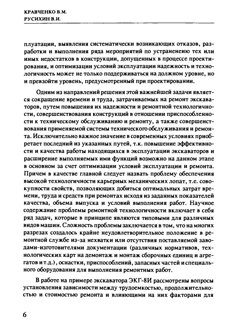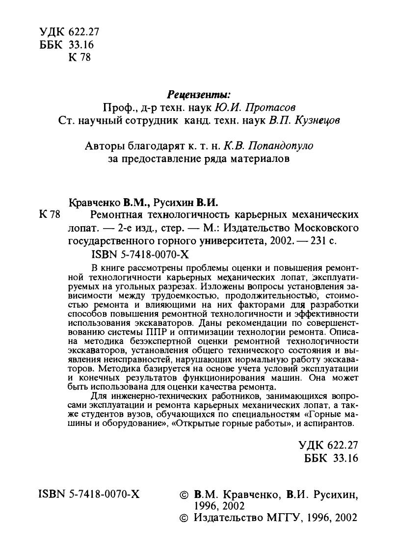 В книге рассмотрены проблемы оценки и повышения ремонтной технологичности карьерных механических лопат, эксплуатируемых на угольных разрезах. Изложены вопросы установления зависимости между трудоемкостью, продолжительностью, стоимостью ремонта и влияющими на них факторами для разработки способов повышения ремонтной технологичности и эффективности использования экскаваторов. Даны рекомендации по совершенствованию системы ППР и оптимизации технологии ремонта. Описана методика безэкспертной оценки ремонтной технологичности экскаваторов, установления общего технического состояния и выявления неисправностей, нарушающих нормальную работу экскаваторов. Методика базируется на основе учета условий эксплуатации и конечных результатов функционирования машин. Она может быть использована для оценки качества ремонта. Для инженерно-технических работников, занимающихся вопросами эксплуатации и ремонта карьерных механических лопат, а также студентов вузов, обучающихся по специальностям «Горные машины и оборудование», «Открытые горные работы», и аспирантов.
