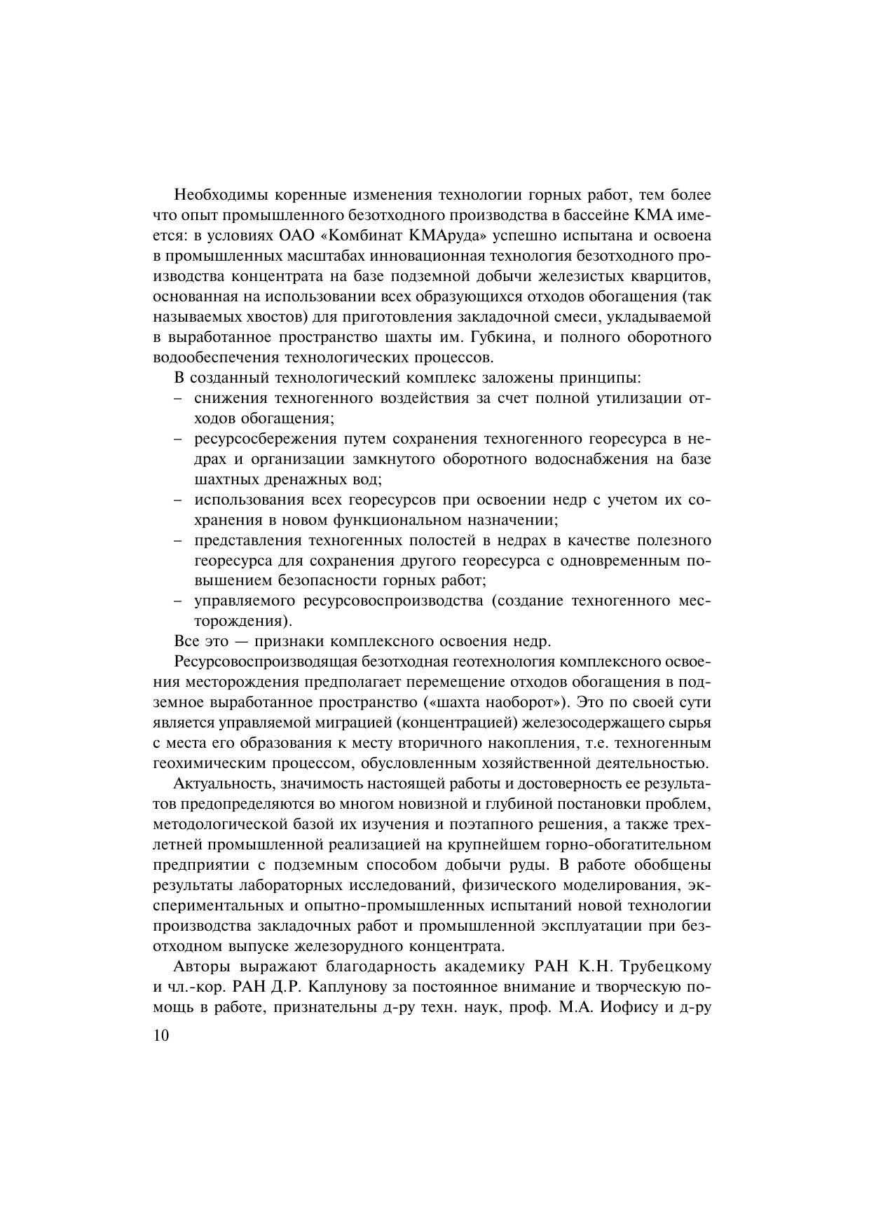 Изложены проблемы создания и поэтапного освоения ресурсосберегающей и ресурсовоспроизводящей безотходной геотехнологии комплексного освоения железорудных месторождений, центральным элементом которой является закладка подземного выработанного пространства отходами обогащения железистых кварцитов. Рассмотрены вопросы взаимо связи добычи руды, выпуска железорудного концентрата, организации оборотного водоснабжения, экономики и экологии горно-обогатительного производства. Для научных и инженерно-технических работников горнодобывающих и обогатительных предприятий, исследовательских и проектных институтов, а также аспирантов и студентов горных специальностей.