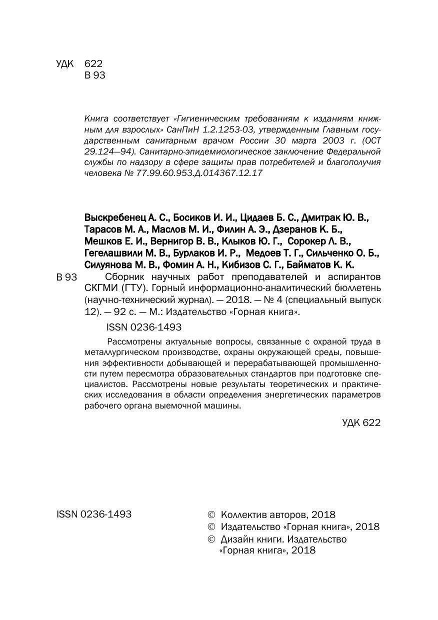 Сборник научных работ преподавателей и аспирантов СКГМИ (ГТУ). Горный информационно-аналитический бюллетень (научно-технический журнал). № 4