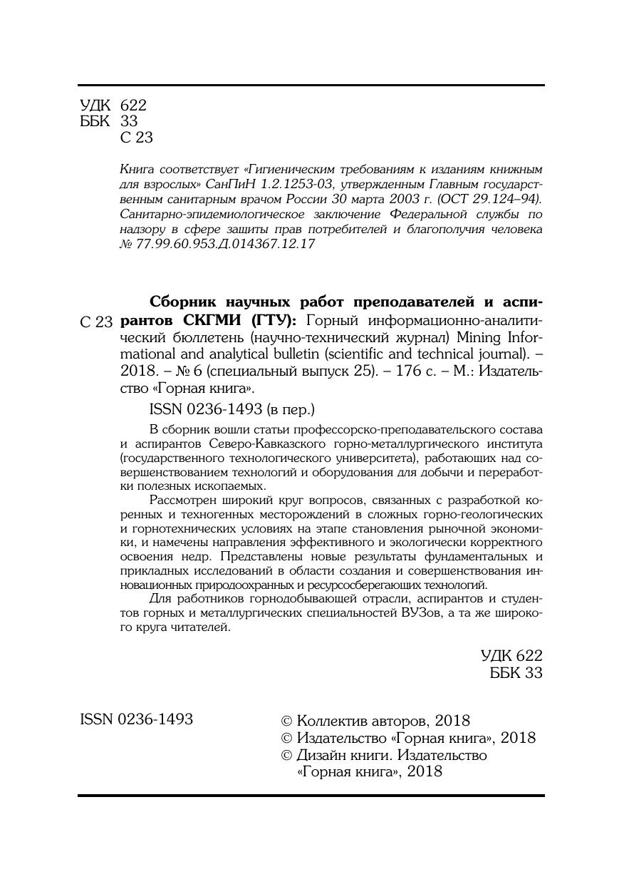 Сборник научных работ преподавателей и аспирантов СКГМИ (ГТУ). Горный информационно-аналитический бюллетень (научно-технический журнал). № 6