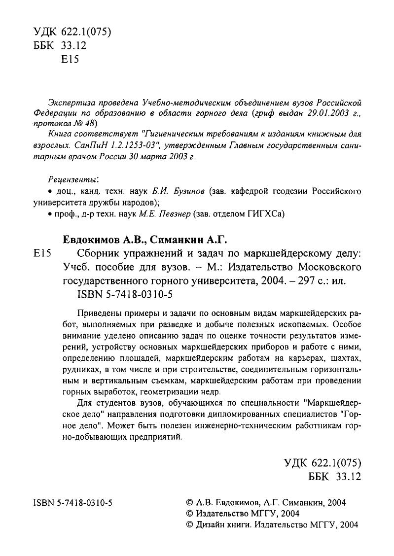 Гриф: Допущено Учебно-методическим объединением вузов Российской Федерации по образованию в области горного дела в качестве учебного пособия для студентов вузов, обучающихся по специальности 090100 «Маркшейдерское дело» направления подготовки дипломированных специалистов 650600 «Горное дело»