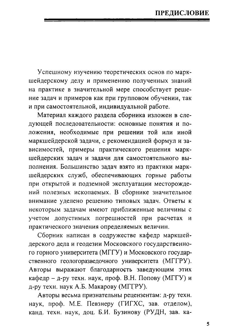 Приведены примеры и задачи по основным видам маркшейдерских работ, выполняемых при разведке и добыче полезных ископаемых. Особое внимание уделено описанию задач по оценке точности результатов измерений, устройству основных маркшейдерских приборов и работе с ними, определению площадей, маркшейдерским работам на карьерах, шахтах, рудниках, в том числе и при строительстве, соединительным горизонтальным и вертикальным съемкам, маркшейдерским работам при проведении горных выработок, геометризации недр. Для студентов вузов.