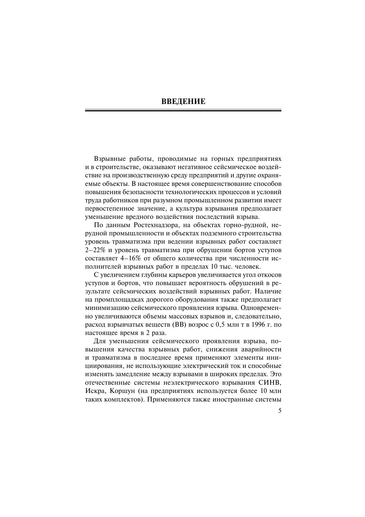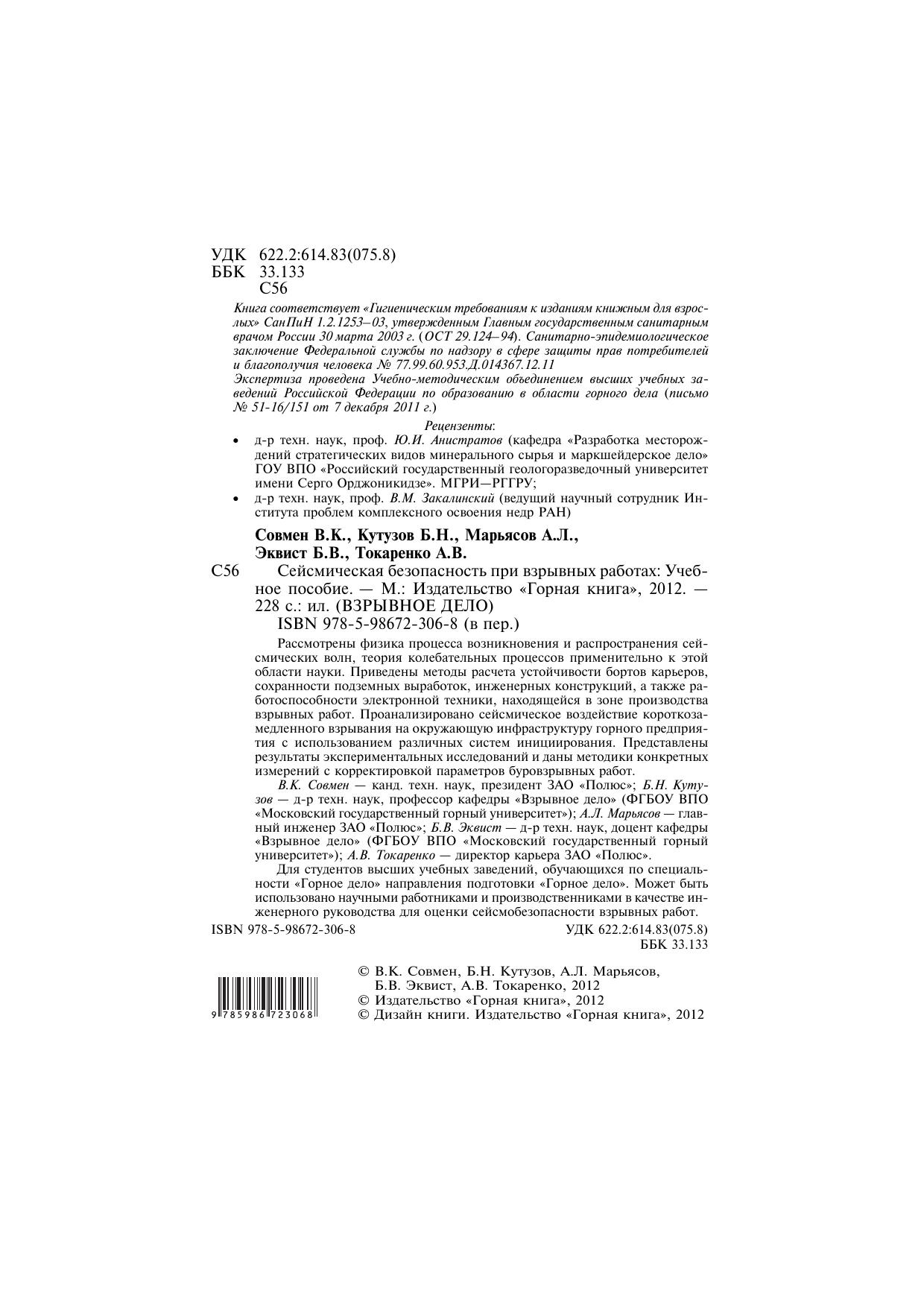 Рассмотрены физика процесса возникновения и распространения сейсмических волн, теория колебательных процессов применительно к этой области науки. Приведены методы расчета устойчивости бортов карьеров, сохранности подземных выработок, инженерных конструкций, а также работоспособности электронной техники, находящейся в зоне производства взрывных работ. Проанализировано сейсмическое воздействие короткозамедленного взрывания на окружающую инфраструктуру горного предприятия с использованием различных систем инициирования. Представлены результаты экспериментальных исследований и даны методики конкретных измерений с корректировкой параметров буровзрывных работ. В.К. Совмен — канд. техн. наук, президент ЗАО «Полюс»; Б.Н. Кутузов — д-р техн. наук, профессор кафедры «Взрывное дело» (ФГБОУ ВПО «Московский государственный горный университет»); А.Л. Марьясов — главный инженер ЗАО «Полюс»; Б.В. Эквист — д-р техн. наук, доцент кафедры «Взрывное дело» (ФГБОУ ВПО «Московский государственный горный университет»); А.В. Токаренко — директор карьера ЗАО «Полюс». Для студентов высших учебных заведений, обучающихся по специальности «Горное дело» направления подготовки «Горное дело». Может быть использовано научными работниками и производственниками в качестве инженерного руководства для оценки сейсмобезопасности взрывных работ
