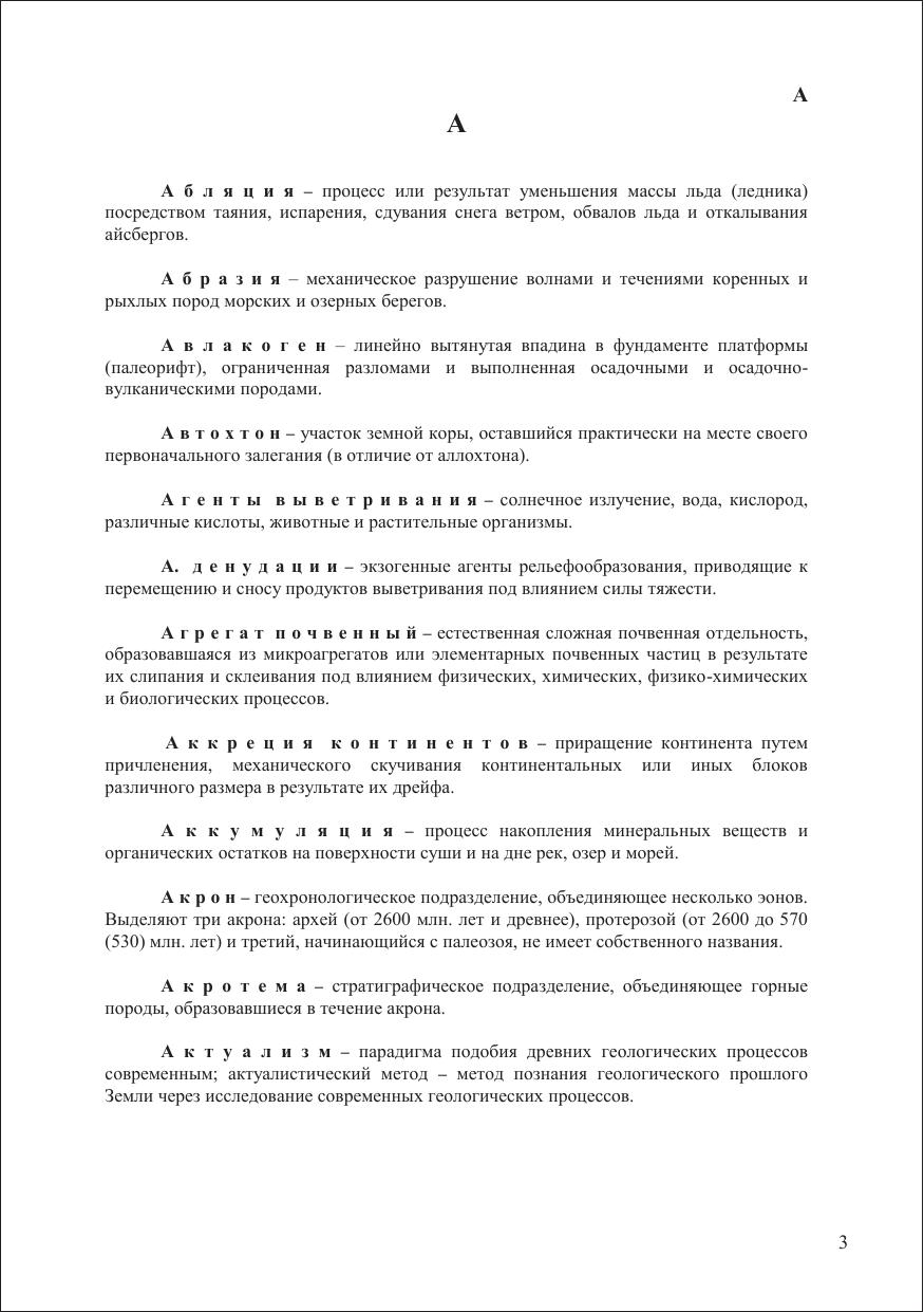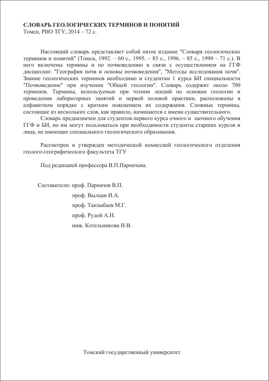 Настоящий словарь представляет собой четвертое издание "Словаря геологических терминов и понятий" (Томск, 1992. – 60 с.1995. – 83 с. 1996. – 85 с., 1999 – 71 с.). В него включены термины и по почвоведению в связи с осуществлением на ГГФ дисциплин: "География почв и основы почвоведения", "Методы исследования почв". Знание геологических терминов необходимо и студентам 1 курса БПФ специальности "Почвоведение" при изучении "Общей геологии". Cловарь содержит около 700 терминов. Термины, используемые при чтении лекций по основам геологии и проведении лабораторных занятий и первой полевой практики, расположены в алфавитном порядке с кратким пояснением их содержания. Сложные термины, состоящие из нескольких слов, как правило, начинаются с имени существительного. Словарь предназначен для студентов первого курса очного и заочного обучения ГГФ и БПФ, но им могут пользоваться при необходимости студенты старших курсов и лица, не имеющие специального геологического образования.