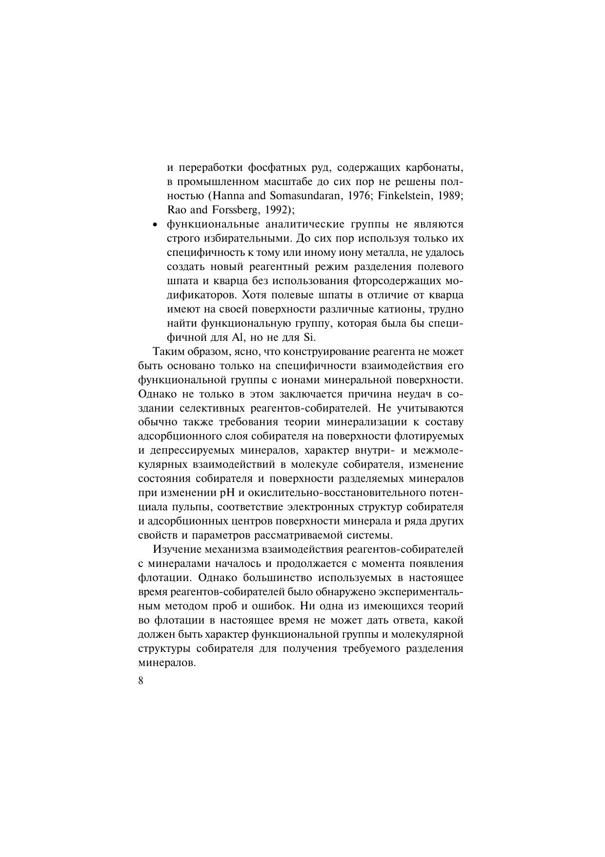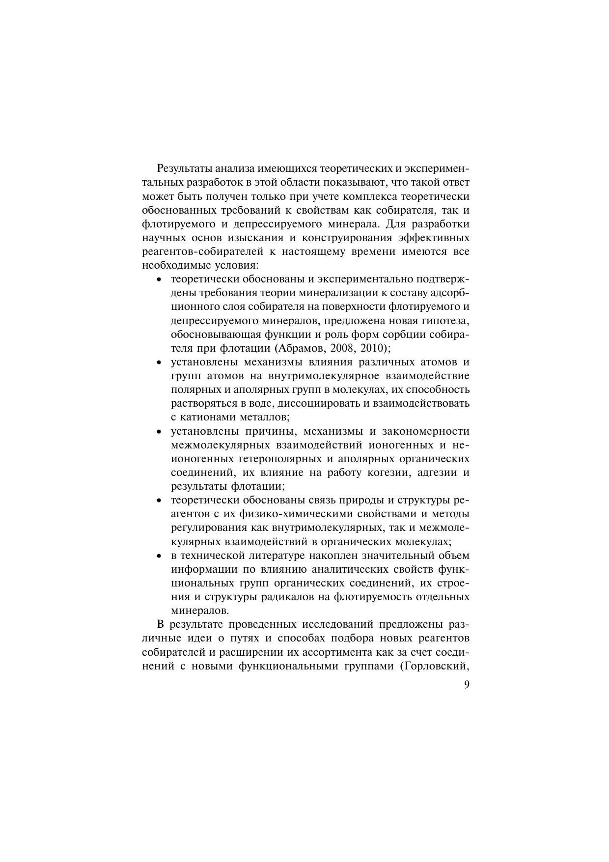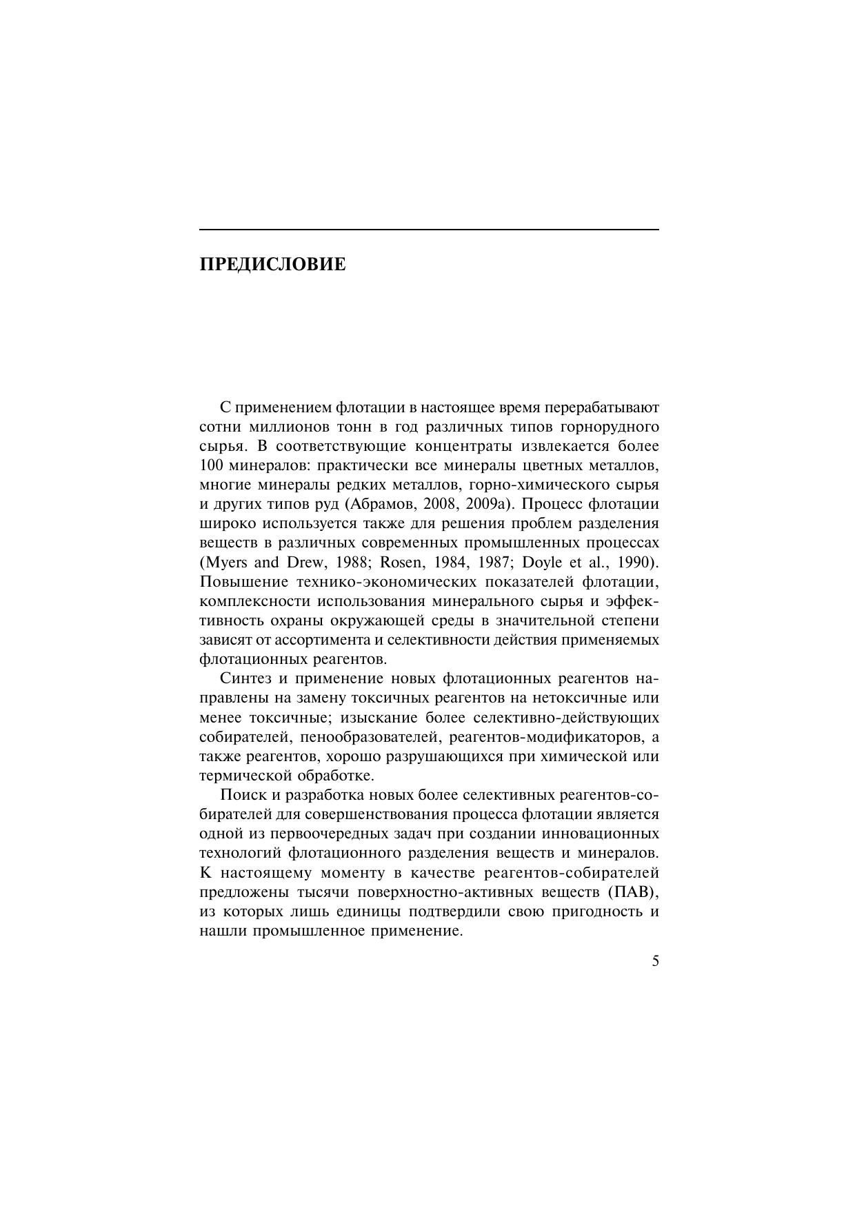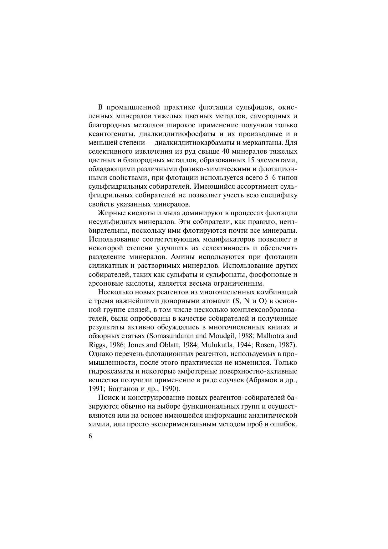 Рассмотрены требования теории флотации к реагентам-собирателям и предложена новая гипотеза, обосновывающая необходимый состав адсорбционного слоя собирателя на поверхности флотируемого и депрессируемого минералов. Приведен анализ физико-химических свойств органических соединений, которые могут быть использованы в качестве собирателей, закономерностей их изменения в результате внутри- и межмолекулярных взаимодействий и показаны пути создания собирателей с заданными свойствами, сформулированы принципы конструирования селективных собирателей. Теоретически обоснованы методы совершенствования технологии применения собирателей, обеспечивающие оптимизацию их расхода, повышение селективности и интенсификацию процесса флотации. А.А. Абрамов — д-р техн. наук, профессор кафедры «Обогащение полезных ископаемых» Московского государственного горного университета. Для студентов вузов, обучающихся по специальности «Обогащение полезных ископаемых» направления подготовки «Горное дело». Может быть использовано научными работниками, инженерами-обогатителями и специалистами в области автоматизации флотационных фабрик при совершенствовании, оптимизации и интенсификации технологических процессов флотационного обогащения минерального сырья.