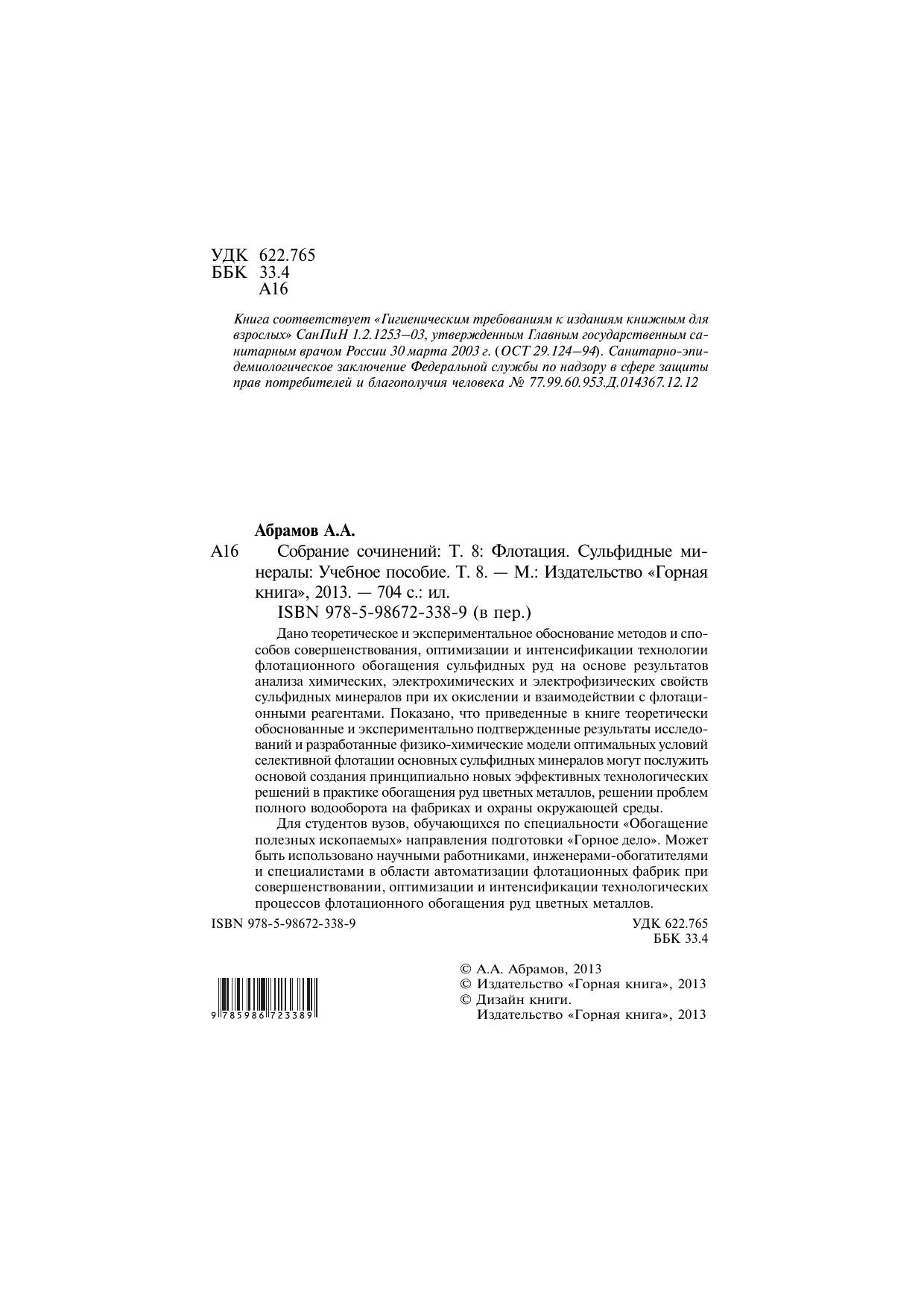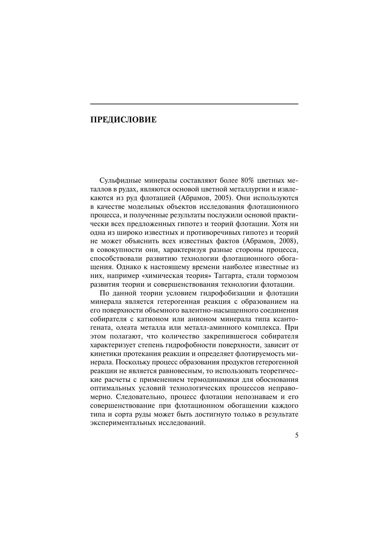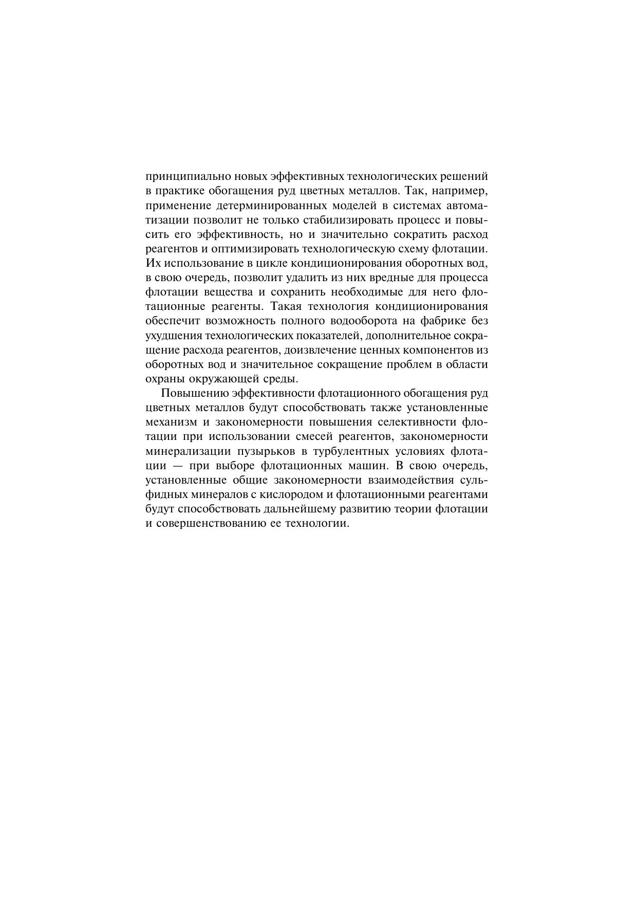 Дано теоретическое и экспериментальное обоснование методов и способов совершенствования, оптимизации и интенсификации технологии флотационного обогащения сульфидных руд на основе результатов анализа химических, электрохимических и электрофизических свойств сульфидных минералов при их окислении и взаимодействии с флотационными реагентами. Показано, что приведенные в книге теоретически обоснованные и экспериментально подтвержденные результаты исследований и разработанные физико-химические модели оптимальных условий селективной флотации основных сульфидных минералов могут послужить основой создания принципиально новых эффективных технологических решений в практике обогащения руд цветных металлов, решении проблем полного водооборота на фабриках и охраны окружающей среды. Для студентов вузов, обучающихся по специальности «Обогащение полезных ископаемых» направления подготовки «Горное дело». Может быть использовано научными работниками, инженерами-обогатителями и специалистами в области автоматизации флотационных фабрик при совершенствовании, оптимизации и интенсификации технологических процессов флотационного обогащения руд цветных металлов.